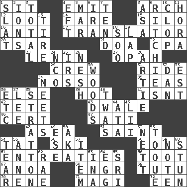 ACROSS 1. Be seated 4. Give off 8. Bowlike part 12. Spoils 14. Conductor's collection 15. Grain storage tower 16. Against 17. Interpreter 20. Russian ruler of old 21. ___ good deed 22. Accounting whiz (abbr.) 23. Soviet premier 1918-24 27. Brightly colored fish 29. Ship's personnel 31. Travel on or in a vehicle 34. With motion or animation 35. Afternoon social gatherings 36. Otherwise 39. Being at a high temperature 41. Is not 42. False hair 43. A sleeping potion; an opiate (poet.) 46. Certainty 47. Suttee (variant) 48. Toward the sea 51. Virtuous person 54. Make lace 56. What Jean-Claude Killy likes to do 58. Immeasurably long periods of time 61. Pleas 66. A blast of a horn 67. Small Philippine buffalo 68. Engineer (abbr.) 69. Ballerina skirt 70. French philosopher Descartes 71. Wise men 72. Car or cant ending DOWN 1. Narrow board 2. Charged particles 3. Add up to 4. Lizard (obsolete) 5. Make imperfect 6. Lyricist Gershwin 7. Be inclined (to) 8. White ___ sheet 9. Actors Guy, Robert Welles, and Clint 10. Hoof sound 11. Israeli folk dance 13. Become fatigued 18. "Barney Miller" actor Jack 19. Infant locale 24. Non-commissioned officer (abbr.) 25. Big collection agency 26. Tender 28. Nick name for Arthur 30. Forest 32. Daniel's nick name 33. Eastern Standard Time (abbr.) 34. Confronts 36. And so on (abbr.) 37. Area sheltered from the wind 38. Ski resort town in Vermont 40. It was, poetically 44. _ moment's notice (2 wds.) 45. Cards in a Roman deck? 49. Compass dir. 50. Alias (abbr.) 52. Remaining after all deductions 53. Woman's close-fitting hat 54. Separate forcefully 55. Queen of England 1702-14 57. Detail 59. Short letter 60. Surprise greatly 62. Actress Charlotte 63. _ tizzy (2 wds.) 64. Oval reproductive body of a fowl 65. Indian title of respect (Mr.)