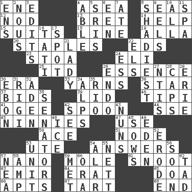 ACROSS 1. Compass dir. 4. At sea 8. Oceans 12. Dreamland 13. Cy Young winner Saberhagen 14. Aid 15. Sets of matching outer garments 18. Actor's bit 19. Silent film actress Nazimova 20. Paper fasteners 22. Begley and Asner 23. Portico 24. Connecticut Ivy Leaguer 25. It would 26. Substance 30. Epoch 33. Entertaining tales 36. Play the lead 37. Auction offers 39. Flaplike covering 40. Native american tent (variation) 41. Double curve, resembling the letter S 42. Soup utensil 44. Compass dir. 45. Simpletons 47. Purpose 50. Adept person 51. Connecting point 53. Shoshoni 54. Replies 57. Billionth: prefix 59. Undercover agent 61. Snob 63. Arab leader 64. Part of Q.E.F. 65. ___ good deed 66. Tenement units (abbr.) 67. Small pie 68. Conclude DOWN 1. Followers of ems 2. Common sense 3. Proofreads 4. Competent 5. Indian titles of respect 6. Car or cant ending 7. Had dinner 8. Most dark, concealed or hidden 9. Snakelike fish 10. 100% 11. Health resort 16. Jacques of French films 17. Blemish 21. Kenny Rogers chart-topper in '80 22. Raised railways 24. Double-curved letter 26. Inside; within (prefix) 27. Nuclear Threat Initiatives 28. Smile enhancers 29. One of the Great Lakes 30. Inky black, to poets 31. Swiss mountan, "Queen of the Mountains" 32. Arabian gulf 34. High mountains 35. River (Sp.) 38. Elected representatives 42. Observe 43. Religious women 46. Frozen water 48. Sty mamas 49. Paradise 52. Wear away 53. A single undivided whole 54. Having or resembling wings 55. Remaining after all deductions 56. Within a short period 57. Teachers' org. 58. Electrical Unit 59. Was introduced to 60. Mouth or opening 62. Bit