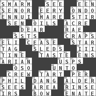 ACROSS 1. Excessive but superficial compliments 6. Observe 9. Car or cant ending 12. Sir (Sp.) 13. Suggestive of the supernatural 14. Southwest Nigerian state 15. World-weariness 16. Female horse 17. Tumult 18. Elected rep. 19. Lubricates 20. 1/640 square mile 21. Letter starter 23. Actress Charlotte 24. Fast planes 25. Dice game 28. Biblical high priest 30. Desist 34. Play the lead 35. Label 36. Bobsleighs 38. One more than two 39. Prong on a fork 41. Clothes sense 43. Followers of ems 44. Believer in; advocate of (suffix) 46. United States Postal Service (abbr.) 48. Bear (Spanish) 49. To (old English) 50. Group working together 51. Small pie 53. For each 56. Silvers or Donahue 57. Mild oath, euphamism for damn 58. Tree or shrub in the Birch family 60. Observes 61. Type of rug 62. Wash lightly 63. Big collection agency 64. Ribbon knot 65. Maternal DOWN 1. Compass dir. 2. Not women's 3. Queen of England 1702-14 4. Periods in a boxing match 5. Medical imaging device (abbr.) 6. Lick closed 7. Blunders 8. Sight organ 9. Pleas 10. Singer Brickell 11. Not either 13. Arab leader 14. Motion picture awards 19. Fertile tracts in a desert 20. Curve 22. And so on (abbr.) 24. Seigniories (variant) 26. Ache 27. Indian titles of respect 28. Singer James 29. Den 31. The first octave above the treble staff 32. Ocean 33. Begley and Asner 37. Check the growth or development of 40. Artist's stands 42. Eastern Standard Time (abbr.) 45. At this time 47. Cotton for raincoats, e.g. 49. Capital and largest city of Mongolia 50. "Mermaids" star 51. Pacific island yam 52. Afresh 54. Pulitzer Prize-winning author Ferber 55. Respite 56. Air pressure measure (abbr.) 57. Small moist lump or mass 58. "We ___ not amused" (Victoria) 59. To separate or throw off