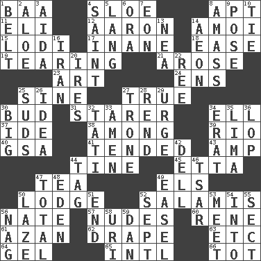 ACROSS 1. Sound made by sheep 4. _ gin 8. Fitting 11. Connecticut Ivy Leaguer 12. Composer Copland 14. Mine, in Marseilles 15. Farming town in central California 17. Lacking in sense or substance 18. Comfort 19. Separating forcefully 21. Came up 23. Tate display 24. Followers of ems 25. Trig term 27. Loyal 30. Partially opened flower 31. A viewer who gazes fixedly 34. Pipe bend 37. Binary compound 38. Amid 39. River (Sp.) 40. Girls' org. (abbr.) 41. Watched over 43. Electrical Unit 44. Prong on a fork 45. Singer James 47. Afternoon social gathering 49. Raised railways 50. Cabin 52. Deli grouping 56. Nathan's nickname 57. Unclothed pictures 60. French philosopher Descartes 61. Muslim summons to prayer 62. Window treatment 63. And so on (abbr.) 64. Set 65. International (abbr.) 66. Small child DOWN 1. Waist strap 2. Medicinal plant 3. Opera by Verdi 4. Virtuous person 5. Austrian-born American filmmaker Fritz 6. Mouth or opening 7. Age 8. Collect or gather 9. Introduce or present, as a question 10. Standoff 13. Teachers' org. 14. A really long time 16. SW Asia republic 20. Angers 22. To separate or throw off 25. Beer foam 26. The content of cognition 27. Heavy duty weighing machine 28. Tear apart 29. Goad 30. Large 32. Jacques of French films 33. So be it 34. Part of Q.E.F. 35. Pale green bean 36. Chop off 42. Small valley 44. Label 46. Russian ruler of old 47. Add up to 48. Locale of original sin 49. Artist's stand 50. Goldbrick 51. Conclusion 52. Back-to-school mo. 53. Rendezvous 54. To the inside or interior of 55. Religious group 56. Tired old horse 58. RI univ. 59. Daniel's nick name