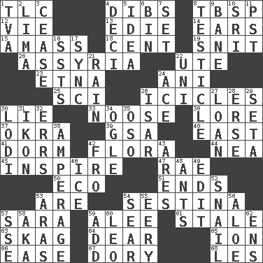 ACROSS 1. Affectionate concern, for short 4. Rights 8. Cook's measure (abbr.) 12. Compete 13. Singer Brickell 14. Hearing organs 15. Collect or gather 18. Penny 19. In a ____ (agitated or irritated) 20. Nineveh was its capital 22. Shoshoni 23. Inactive volcano in Sicily 24. Black tropical American cuckoo 25. _-fi 26. Winter's stalactites 30. Untruth 33. Trap for birds or small mammals 36. Old wives' tales, e.g. 37. Gumbo ingredient 39. Girls' org. (abbr.) 40. Compass direction 41. Dormintory (informal) 42. Plants 44. Teachers' org. 45. Heighten or intensify 47. Actress Charlotte 50. Environmental prefix 51. Extremities 53. "We ___ not amused" (Victoria) 54. French poetic form 57. "Two Mules for Sister ____" 59. Toward shelter 61. Showing deterioration from age 63. Heroin 64. Letter starter 65. Electrically charged atom 66. Comfort 67. Small, narrow, flatbottom fishing boat 68. French article DOWN 1. Federal power corp. 2. Pale green bean 3. Stop 4. Tenth: prefix 5. The main thing one is thinking about 6. Storage container 7. Put into a specified state 8. A testis 9. Object of repulsion 10. Indian title of respect (Mr.) 11. Pacific Standard Time (abbr.) 16. Fast planes 17. Synchronize (abbr.) 21. Water falling in drops from the sky 22. Single; one (prefix) 24. Adept person 26. Austrian river, tributary to the Danube 27. Grant temporary use of 28. Celtic language 29. Bristle 30. Farming town in central California 31. Image 32. Blunders 34. Stare 35. Bear (Spanish) 38. Electrical Measurement 42. From 43. Ancient Greek god of war 46. Frozen water 48. Pismires 49. Prepare for publication 52. Slow-paced one 53. Ancient river in northeast Turkey 54. Burn superficially 55. Suggestive of the supernatural 56. _ vera 57. Compass dir. 58. Alias (abbr.) 59. Increase 60. Lion 62. Followers of ems