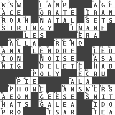 ACROSS 1. Compass dir. 4. Desk light 8. Mature 11. Adept person 12. Declaim 14. SW Asia republic 15. Wander aimlessly 17. Brizilian seaport 18. Arranges properly for use 19. Slender, wiry 21. Empty; void 23. French article 24. Epoch 25. Silent film actress Nazimova 27. San ____ (Riviera town) 30. Nanny (var.) 31. Poe poem 34. Directed 37. Electrically charged atom 38. Annoying sound 39. White ___ sheet 40. Russian fighter aircraft 41. Erase 43. Possessed 44. More than one (prefix) 45. Shade of tan 47. Sliced dessert 49. Insect wing 50. Give a jingle 52. Replies (to) 56. A really long time 57. Honkers 60. Stricken, poetically 61. Floor coverings 62. An organ shaped like a helmet 63. Wedding promise 64. Adept person 65. Russian ruler of old 66. Afternoon social gathering DOWN 1. Armed conflicts 2. Native of Scotland 3. Erode 4. Yearns 5. Like ___ of sunshine 6. Floor covering 7. Parent Teacher Assoc. 8. Sports stadium 9. Yard entry 10. Followers of ems 13. Biblical high priest 14. Austrian river, tributary to the Danube 16. Place where flour is made 20. Be tempered by heat 22. Modern: prefix 25. Mine, in Marseilles 26. Austrian-born American filmmaker Fritz 27. Agitated, as a liquid 28. Celtic language 29. Rendezvous 30. Direct toward a target or goal 32. Inside; within (prefix) 33. Christmas carol 34. Cowardly lion portrayer 35. Son of Isaac 36. June honoree 42. Snakelike fish 44. Writing instrument 46. Crow sounds 47. Picture 48. Charged particles 49. Approach 50. Lightbulb-shaped fruit 51. Ovum 52. At sea 53. Give off 54. Travel on or in a vehicle 55. Portico 56. Electrical Unit 58. Consume 59. Raised railways