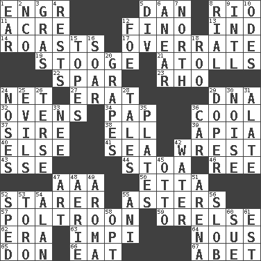 ACROSS 1. Engineer (abbr.) 5. One of the 12 tribes of Israel 8. River (Sp.) 11. Measure of real estate 12. Fine (Spanish) 13. Indiana (abbr.) 14. Exposes to great heat 17. Make much ado about nothing 19. Moe Howard, for one 21. Ringlike coral islands and reefs 22. Coast Guard woman 23. 17th letter of the Greek alphabet 24. Fish or hair follower 27. Part of Q.E.F. 29. Heredity factor (abbr.) 32. Baking chambers 34. Infant food 36. Calm and collected 37. Title for a man of rank and authority 38. Pipe bend 39. Capital of Western Samoa 40. Otherwise 41. Ocean 42. Obtain by seizing forcibly or violently 43. Compass dir. 44. Portico 46. To riddle 47. Auto club (abbr.) 50. Singer James 52. A viewer who gazes fixedly 55. Michaelmas daisies 57. Coward 59. Threatening words 62. Epoch 63. Body of Kaffir warriors 64. Common sense 65. Spanish title 66. Erode 67. Collude with DOWN 1. Hearing organ 2. Non-commissioned officer (abbr.) 3. Pate de foie ____ 4. Musical pauses 5. HTML Container Element 6. Approach 7. 0 degrees 8. Monetary unit of Yemen 9. International (abbr.) 10. Lyric poems 12. Enemy 15. Drinks excessively 16. Fly high 18. Friend of Pooh 20. Raisin fruits 24. Olfactory organs 25. Vices 26. Laconic 28. Falsehoods 29. Drug addict 30. Annoying sound 31. Having winglike extensions 33. Born 35. Food holders 36. 4-wheeled motor vehicle 42. Wetness 45. Von Bismarck 47. Tate display 48. Nest on high 49. Odor 51. Sports stadium 52. Hurried 53. "Corrida" creature 54. ____ Jay Lerner 55. Black tropical American cuckoo 56. Oscar Madison type 58. Elect 60. Institute legal proceedings 61. Eastern Standard Time (abbr.)