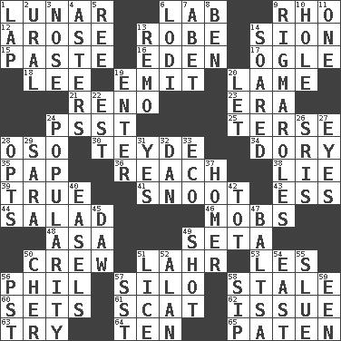 ACROSS 1. Type of eclipse 6. Experiment locale 9. 17th letter of the Greek alphabet 12. Came up 13. Loose flowing garment 14. The Jewish people; Israel 15. Thick mixture 16. Paradise 17. Stare 18. Area sheltered from the wind 19. Give off 20. Unable to walk 21. Western Nevada city 23. Period 24. Inconspicuous attention getter 25. Laconic 28. Bear (Spanish) 30. Miss Universe 1986, Barbara Palacios _ 34. Dinghy 35. Infant food 36. Arrive at 38. Falsehood 39. Loyal 41. Snob 43. Double-curved letter 44. First course 46. Crowds into 48. White ___ sheet 49. Bristle 50. Ship's personnel 51. Cowardly lion portrayer 53. French article 56. Silvers or Donahue 57. Grain storage tower 58. Lacking originality or spontaneity 60. Puts into a specified state 61. Go away! 62. Come out of 63. Attempt to accomplish something 64. "___ Little Indians" 65. Eucharist need DOWN 1. Infant locale 2. Mountain range 3. Olfactory organ 4. Michaelmas daisies 5. To sift 6. Farming town in central California 7. Collude with 8. Benjamin's nick name 9. Frustrating wastes of time 10. Opening into or through something 11. Single 13. San ____ (Riviera town) 14. Flew 19. Keyboard key 20. Allow 22. Eastern Standard Time (abbr.) 24. Teen's desire 26. Indian titles of respect 27. Snake ____ (dice throw) 28. Chooses 29. "Two Mules for Sister ____" 31. Consenting reply 32. One of the 12 tribes of Israel 33. Environmental prefix 37. Homing pigeon 40. Artist's stands 42. Small child 45. Fool 47. Greek mezzo-soprano Agnes 49. Opportunity 50. "Mermaids" star 51. Louse (plural) 52. Actor Alda or Thicke 54. Compass direction 55. Turn sharply 56. Pacific Standard Time (abbr.) 57. Fast jet (abbr.) 58. Small drink 59. Car or cant ending