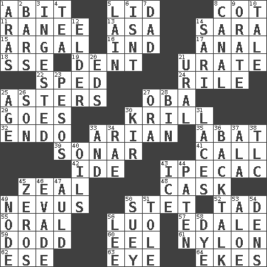 ACROSS 1. "This won't hurt ____!" 5. Hat (slang) 8. Small bed 11. Indian princess (variant) 13. White ___ sheet 14. "Two Mules for Sister ____" 15. Therefore, facetiously 16. Working for oneself (abbr.) 17. Of or related to the anus 18. Compass dir. 19. Scratch 21. A salt of uric acid 22. Moved rapidly 24. Cause heat under the collar 25. Michaelmas daisies 27. Chief or king in Benin or Nigeria 29. Moves 30. Shrimp-like planktonic crustaceans 32. Inside; within (prefix) 33. Believer in; advocate of (suffix) 35. Blind as ____ 39. Underwater navigation system 41. Give a ring to 42. Binary compound 43. Medicinal drug used to evoke vomiting 45. Ardor 48. Keg 49. Congenital growth or mark on the skin 50. Proofreading order 52. Bit 55. Taken by mouth 56. Nilotic language 57. Peak District village in England 59. Texas town _ City 60. Snakelike fish 61. High-strength synthetic material 62. Compass dir. 63. Sight organ 64. Makes supply last DOWN 1. Caspian sea tributary 2. Taverns 3. Swallowed 4. Beverage made from leaves 5. (Had) reclined 6. Is not 7. Male parent 8. Lessep's creation 9. Declaim 10. Falsehood 12. A person who is older than you are 14. Indian skirt 20. Begley and Asner 21. Mountain range 23. Mexican monetary units 25. Ripen 26. Male child 27. Mouth or opening 28. Storage container 30. Apertif with cassis 31. Shoestrings 33. Added to 34. Actress Charlotte 36. Sass 37. In the manner of 38. Affectionate concern, for short 40. Lubricates 43. Frozen water 44. Eucharist need 45. Nothings 46. Elude 47. Old (Scot.) 49. Thickened enlargement 50. Chop _ 51. Lacquered or enameled metalware 53. Medicinal plant 54. Habitations of wild animals 56. Area sheltered from the wind 58. Color