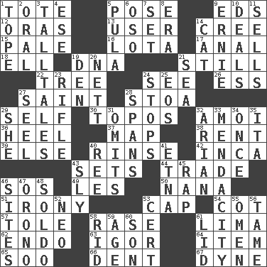 ACROSS 1. Lug 5. Introduce or present, as a question 9. Begley and Asner 12. Mouths or openings 13. One who makes use of a thing 14. Algonquian 15. Light colored 16. Globular water bottle used in Asia 17. Of or related to the anus 18. Pipe bend 19. Heredity factor (abbr.) 21. Not moving 22. Relationship diagram 24. Perceive with the eye 26. Double-curved letter 27. Inhabitant of Heaven 28. Portico 29. Automatically 30. Traditional theme or motif 32. Mine, in Marseilles 36. Person who is morally reprehensible 37. Atlas unit 38. Monthly bill 39. Otherwise 40. Remove soap 42. South American Indian 43. Puts into a specified state 44. Swap 46. Mayday 49. French article 50. Grandmother 51. Literary sarcasm 53. Head covering 54. Small bed 57. Lacquered or enameled metalware 58. Raze (variant) 61. Pale green bean 62. Inside; within (prefix) 63. Composer Stravinsky 64. A distinct part 65. "Barney Miller" actor Jack 66. Incision 67. Centimeter-gram-second unit of force DOWN 1. Drink excessively 2. Of the mouth 3. Baron Munchausen's specialties 4. Compass dir. 5. Monetary unit of Botswana 6. Bear (Spanish) 7. Put into a specified state 8. Period 9. Bert's buddy 10. Allots cards 11. Exchanges for money 14. Domesticated feline 19. Lair 20. Remaining after all deductions 21. Ocean 23. Firearm 24. Halts 25. Greek goddess of the dawn 27. Sew up the eyelids of hawks and falcons 28. Connects, as a bridge 29. A female animal or person 31. Leaves out 32. Believer in; advocate of (suffix) 33. Ananias' fault 34. At one time in the past 35. Call ___ day 40. To separate or throw off 41. Inactive volcano in Sicily 43. Playfully artful 45. Reproach for some lapse or misdeed 46. Settings 47. U. of Maine site 48. Twentieth part of a lira 52. Modern: prefix 53. Sure thing 55. Presage 56. Not wild 58. To free from 59. Grow older 60. Male child 61. Hat (slang)