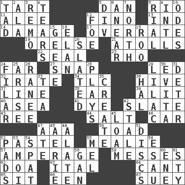 ACROSS 1. Small pie 5. One of the 12 tribes of Israel 8. _ de Janeiro 11. Toward shelter 12. A pale, very dry sherry 13. Working for oneself (abbr.) 14. Break 17. Make much ado about nothing 19. Threatening words 21. Ringlike coral islands and reefs 22. Lick closed 23. 17th letter of the Greek alphabet 24. At a great distance 27. Fastener 29. Directed 32. Feeling or showing extreme anger 34. Affectionate concern, for short 36. Hub of activity 37. Actor's bit 38. Hearing organ 39. Came down and settled, as after flight 40. Toward the sea 41. Color 42. Schedule 43. To sift 44. Table seasoning 46. 4-wheeled motor vehicle 47. Auto club (abbr.) 50. Frog relative 52. Soft color 55. Ear of corn 57. Electrical Measurement 59. Makes clutter 62. ___ good deed 63. Slanted text style (abbr.) 64. Patter 65. Be seated 66. Car or cant ending 67. Chop _ DOWN 1. Small boy 2. According to 3. San ____ (Riviera town) 4. Separates forcefully 5. HTML Container Element 6. Approach 7. _ pole 8. Monetary unit of Yemen 9. International (abbr.) 10. Lyric poems 12. Enemy 15. Honkers 16. Liveliness 18. Friend of Pooh 20. Scheduled 24. Of or pertaining to a thread or threads 25. Ascend 26. Indian princess (variant) 28. Live dramatic performances 29. Pale purple color 30. Webber/Rice musical 31. Prevent from occurring 33. Beverage made from leaves 35. Cause to be 36. Actor Linden 42. Having lost freshness 45. Rich soil 47. Had dinner 48. Nest on high 49. Having winglike extensions 51. Plates 52. Groovy apts. 53. Mine, in Marseilles 54. Argument over a trivial matter 55. Cartoonist voice _ Blanc 56. He sold his birthright 58. Separate the seeds from cotton 60. Compass dir. 61. Filthy place