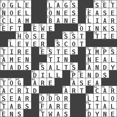 ACROSS 1. Stare at amorously 5. Fails to keep up a pace 9. Arrange properly for use 12. Christmas carol 13. Washington bills 14. Comfort 15. Burrowing marine mollusk 16. Object of repulsion 17. One who doesn't tell the truth 18. Lizard (obsolete) 19. She-sheep 21. Pig sounds 22. Stockings 24. Fast jet (abbr.) 26. Make a knot 27. Prying instrument 28. Native of Scotland 29. Become fatigued 30. _____ Park, CO 32. Naughty children 36. So be it 37. Metal container 38. Actress Patricia 39. Bits 40. Table seasonings 42. Actor Griffith 43. Deli pickle 44. Hangs 46. Coat; cloak 49. "We ___ not amused" (Victoria) 50. Toward the sea 51. Bitter 53. Tate display 54. Automobile 57. Scorch 58. Scent 61. _ and Stitch 62. Bar bills 63. Conductor's collection 64. Slanted text style (abbr.) 65. Followers of ems 66. It was, poetically 67. Centimeter-gram-second unit of force DOWN 1. At one time in the past 2. Eighteen holes 3. Tough but pliablecoriaceous 4. Shade tree 5. Ear part 6. Santa ___, CA 7. Commissioned mil. rank 8. Compass dir. 9. Virtuous person 10. 1973 Nobel Price Winner (Physics) Leo 11. Laconic 14. Biblical high priest 19. Compass dir. 20. Past tense of be (plural) 21. Baseball player Mel 23. Baking chambers 24. Odor 25. Mayday 27. Pale green bean 28. Free from disturbance or agitation 29. Make lace 31. Showing deterioration from age 32. Empty; void 33. Ananias' fault 34. Groovy apts. 35. Playfully artful 40. Title for a knight 41. Practice fight 43. Male parent 45. Eastern Standard Time (abbr.) 46. Clothes sense 47. Sea 48. Catches 52. Big collection agency 53. Ancient Greek god of war 55. Actor Alda or Thicke 56. Hero or heavy, e.g. 58. Often (poetically) 59. Simpleton 60. Mouth or opening 61. Flaplike covering
