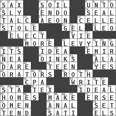 ACROSS 1. Saxophone 4. The visible part of the earth's surface 8. To (old English) 12. Mischievous 13. Inside; within (prefix) 14. Lick closed 15. Baby powder 17. A really long time 18. Cell (Danish) 19. Took without asking 21. Set 23. Lion 24. Choose 26. Compete 28. Greater amount 30. Imposing or collecting, as a tax 34. It is 37. It may be bright or harebrained 39. Arab leader 40. Teachers' org. 41. Pig sounds 43. In the manner of 44. Have the gumption 46. Adolescent 47. Affirmative reply 48. Speakers 51. Writer of Portnoy's Complaint (1969) 54. Accounting whiz (abbr.) 55. Compose 58. R.R. building 61. John Ritter's dad 63. Standard of perfection 65. Residences 67. Cause to be 71. Celtic language 72. Presage 73. Of or related to the anus 74. Put into a specified state 75. Watch over 76. Suttee (variant) 77. Raised railways DOWN 1. Fast planes 2. Having winglike extensions 3. Xylene (variant) 4. Ocean 5. Single 6. Wedding promise 7. Protracted 8. Purpose 9. 1994 drama film starring Jodie Foster 10. Lie 11. Margarine 16. Clement's nick name 18. 154 in Roman numerals 20. Environmental prefix 22. First lady 25. Musical group of three 27. Sight organ 29. Proofreads 30. Member of a famous L.A. basketball team 31. "If ____ say so..." 32. "Death on the ____" 33. Pate de foie ____ 34. _ china 35. Pull into pieces 36. "Two Mules for Sister ____" 38. Compass dir. 42. Frozen precipitation 45. And so on (abbr.) 49. Elects 50. Actress Charlotte 52. Three (prefix) 53. Flintstone garb 56. Laconic 57. Artist's stand 58. Attempt 59. Heavy book 60. So be it 62. Dec. holiday 64. Allows 66. Conclude 68. Santa ___, CA 69. Krazy ___ of comics 70. Biblical high priest