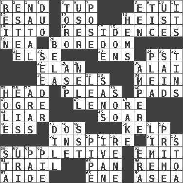 ACROSS 1. Tear apart 5. Uncastrated adult male sheep 8. Needle holder 12. He sold his birthright 13. Bear (Spanish) 14. Robbery 15. "Tell ____ the Marines!" 16. Homes 19. Teachers' org. 20. Mood resulting from idleness 21. Otherwise 23. Followers of ems 24. Pacific Standard Time (abbr.) 27. Liveliness 30. Jai _ 31. Artist's stands 34. Count _ (2 wds.) 35. Froth on beer 38. Entreaties 40. Groovy apts. 41. Legendary monster 42. Poe poem 44. One who doesn't tell the truth 45. Fly high 46. Curvy letter 47. Two (Sp.) 50. Seaweed 53. Heighten or intensify 57. Big collection agency 59. Supplementary 63. Send forth 64. Drop behind 65. Baking dish 66. San ____ (Riviera town) 67. Helper 68. Compass dir. 69. Toward the sea DOWN 1. It's straight from the horse's mouth 2. First name in cosmetics 3. Brizilian seaport 4. Superhero pair 5. "Corrida" creature 6. One who uses or employs something 7. Introduce or present, as a question 8. Car or cant ending 9. Nervous spasm 10. Purpose 11. ___ a Wonderful Life 14. Cloth borders 17. Binary compound 18. Spanish title 20. Actor Lugosi 22. Sowing specialist 24. Entreaty 25. Expressed in words 26. Airtight sealed metal containers 28. Cleo's killer 29. 1994 drama film starring Jodie Foster 30. Electrical Unit 32. Area sheltered from the wind 33. Without 35. Opening into or through something 36. The front part of a cuirass 37. Ancient river in northeast Turkey 39. "Barney Miller" actor Jack 43. Libertine 47. Deli pickle 48. Single 49. Fast jet (abbr.) 51. Citrus fruits 52. A-one 54. Corncob 55. "Terrible" tsar 56. French philosopher Descartes 58. Portico 59. R.R. building 60. RI univ. 61. Groovy apt. 62. Sliced dessert 63. Period