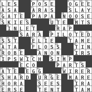 ACROSS 1. French article 4. Airs 8. Double curve, resembling the letter S 12. White ___ sheet 13. Caspian sea tributary 14. Kill 15. Yard entry 17. Dad 18. Trap for birds or small mammals 19. Atmospheres 21. Shoshoni 23. Mountains (abbr.) 24. An arm off of a larger body of water 26. Reproach for some lapse or misdeed 28. "Two Mules for Sister ____" 30. Manned the helm 34. Fast jet (abbr.) 37. Writer Wiesel 39. Not wild 40. "One Day ___ Time" 41. Soft thread for cleaning between teeth 43. Metal container 44. Loose flowing garment 46. At once, immediately (arch.) 47. Big collection agency 48. NE Massachusetts town 51. Simple or foolish person 54. Environmental prefix 55. Components 58. Had dinner 61. Oval reproductive body of a fowl 63. One who wires 65. Pottery fragment 67. Goad 71. Female horse 72. Israeli folk dance 73. Perceives with the eye 74. Retirement account (abbr.) 75. Celtic language 76. Portable shelter 77. Scottish cap DOWN 1. Straggles 2. 1973 Nobel Price Winner (Physics) Leo 3. Smooth fabric 4. Infant food 5. Mouth or opening 6. Plant excrement 7. Son of Isaac 8. Bear (Spanish) 9. Seize upon or latch onto something 10. Compass direction 11. Snake ____ (dice throw) 16. Snakelike fish 18. Be tempered by heat 20. Ocean 22. Three (prefix) 25. Not kosher 27. Plant holder 29. Assad's deity 30. Mexican monetary units 31. Jacques of French films 32. Independent ruler or chieftain 33. Lairs 34. Indian skirt 35. Discontinue 36. Bar bills 38. Electrically charged atom 42. Sever or remove by pinching or nipping 45. She-sheep 49. On the rocks 50. Gear tooth 52. Informal term for the mouth 53. Demure 56. Distinguishing feature 57. Spanish missionary in California 58. American tennis player Robert 59. Son of Odin 60. Hearing organs 62. Abrupt rush of wind 64. 480, 500 or 516 sheets of paper 66. Actress Charlotte 68. Portuguese money of account (variant) 69. Commissioned mil. rank 70. Eastern Standard Time (abbr.)