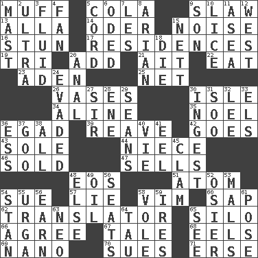 ACROSS 1. Bungle 5. Root beer relative 9. Cole _ (cabbage dish) 13. Silent film actress Nazimova 14. Baltic tributary 15. Annoying sound 16. Surprise greatly 17. Homes 19. Three (prefix) 20. Increase 21. Small island 22. Consume 23. Arabian gulf 25. Fish or hair follower 26. Flower holders 30. Capri or Wright 34. Place in a line 35. Christmas carol 36. Mild oath 39. Rob, plunder, or pillage 42. Leaves 43. Flatfish 44. Sibling's daughter 46. Exchanged or delivered for money 47. Makes a sale 48. Greek goddess of the dawn 51. Smallest unit of an element 54. Take to court 57. Falsehood 58. Zeal 60. Plant excrement 62. Interpreter 65. Grain storage tower 66. Match 67. Lie 68. Snakelike fish 69. Billionth: prefix 70. Takes to court 71. Celtic language DOWN 1. Vertical spar for supporting sails 2. Extreme 3. Watery 4. Avid follower 5. Drawstring 6. Wrote a lyric poem 7. French article 8. Believer in; advocate of (suffix) 9. Male offspring 10. Louse (plural) 11. At sea 12. Compass direction 15. Remaining after all deductions 18. Pass on 20. Of or related to the anus 24. Dodged 27. Title for a knight 28. Compass dir. 29. Seines 30. Consume 31. "Barney Miller" actor Jack 32. Area sheltered from the wind 33. Raised railways 36. Double-curved letter 37. Thick or sticky substance 38. 100% 40. Compete 41. Snakelike fish 45. Dollar (slang) 48. Otherwise 49. Lubricate 50. Theater features 52. Flexible twig of a willow tree 53. Promenades 54. Comedian Laurel of Laurel & Hardy 55. Capital and largest city of Mongolia 56. Merit 58. Grand slam 59. Angers 61. Introduce or present, as a question 63. Modern: prefix 64. The 19th letter of the Greek alphabet 65. Observe