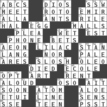 ACROSS 1. Lettered men learn these first 5. "Vaya con ____" 9. Compass dir. 12. Rendezvous 13. Printing process, for short 14. Independent ruler or chieftain 15. Silent film actress Nazimova 16. Pismires 17. Cause heat under the collar 18. Actor Linden 19. Ovum 21. Shopping centers 22. Entreaty 24. Soggy 26. Eastern Standard Time (abbr.) 27. Give a jingle 28. Wagers 29. Age 30. Pale purple color 32. Comedian Laurel of Laurel & Hardy 36. Austrian-born American filmmaker Fritz 37. Not either 38. Light colored 39. Ancient Greek god of war 40. Splash clumsily 42. Margarine 43. Passed on 44. Learning spot: Fr. 46. Choose 49. Tate display 50. Monthly bill 51. Verbally 53. Bear (Spanish) 54. Small island 57. Within a short period 58. Smallest unit of an element 61. _ vera 62. Needle holder 63. Actor's bit 64. Elected reps. 65. Compass dir. 66. Adolescent 67. Inconspicuous attention getter DOWN 1. Nursemaid 2. Actor Lugosi 3. Portable communications device 4. R.R. building 5. To draw with force 6. Electrically charged atom 7. Baseball player Mel 8. Mayday 9. Grin 10. Beverly of Met fame 11. Obtain by seizing forcibly or violently 14. Period 19. Car or cant ending 20. Highlander 21. Mountains (abbr.) 23. Yearns 24. Erodes 25. And so on (abbr.) 27. Lightbulb-shaped fruit 28. Vital fluid 29. Chicken ___ king 31. An arm off of a larger body of water 32. Soup utensil 33. Baron Munchausen's specialties 34. Toward shelter 35. Modern: prefix 40. Title for a knight 41. Possessive pronoun 43. Male parent 45. Corporate head (abbr.) 46. Fertile tracts in a desert 47. Graphs 48. Woman's close-fitting hat 52. Single; one (prefix) 53. Sign of things to come 55. Charged atoms 56. Trial 58. The first octave above the treble staff 59. Standoff 60. Single 61. Cleo's killer