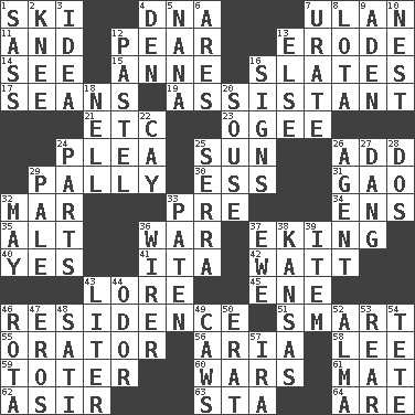 ACROSS 1. What Jean-Claude Killy likes to do 4. Heredity factor (abbr.) 7. ____ Bator, Mongolia 11. Plus 12. Lightbulb-shaped fruit 13. Wear away 14. Perceive with the eye 15. Singer Murray 16. Chalkboards 17. Actors Connery and Penn 19. Helper 21. And so on (abbr.) 23. Double curve, resembling the letter S 24. Entreaty 25. Player for Phoenix 26. Increase 29. Friendly 30. Double-curved letter 31. E Mali city 32. Third mo. 33. Before (prefix) 34. Followers of ems 35. The first octave above the treble staff 36. Armed conflict 37. Supplementing with great effort 40. Consenting reply 41. Call ___ day 42. Electrical Unit 43. Old wives' tales, e.g. 45. Compass dir. 46. Dwelling 51. Don Adams' spy role 55. Speaker 56. Roberta Peters solo 58. Area sheltered from the wind 59. Carrier 60. Armed conflicts 61. Floor covering 62. SW Saudi Arabia district 63. R.R. building 64. "We ___ not amused" (Victoria) DOWN 1. Backtalk 2. Leg joint 3. The main thing one is thinking about 4. Lair 5. Nanny 6. Ancient Greek god of war 7. A salt of uric acid 8. Globular water bottle used in Asia 9. An important port of Yemen 10. A home for chicks 12. Soft color 13. Otherwise 16. Omens 18. 1994 drama film starring Jodie Foster 20. Boozer 22. Island 24. Pieces 25. Father Junipero _ 26. Rep 27. Mild oath, euphamism for damn 28. Two (Sp.) 29. Light colored 32. Fifth month 33. Eucharist need 36. One who wires 37. She-sheep 38. Sunflower state 39. A whole individual unit 43. 61 cubic inches 44. Scent 46. Roll call or roster of names 47. Greek god of love 48. Suttee (variant) 49. Crow sounds 50. Part of Q.E.F. 52. _ mater 53. Hitchcock's "____ Window" 54. Wig 57. Retirement account (abbr.)