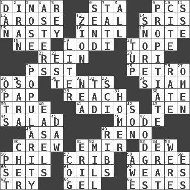 ACROSS 1. Middle Eastern gold or silver currency 6. R.R. building 9. Personal Computers (abbr.) 12. Came up 13. Ardor 14. Indian titles of respect 15. Thoroughly unpleasant 16. International (abbr.) 17. Observe 18. Born 19. Farming town in central California 20. Drink excessively 21. It's straight from the horse's mouth 23. RI univ. 24. Inconspicuous attention getter 25. Stone: prefix 28. Bear (Spanish) 30. Portable shelters 34. Thailand, formerly 35. Infant food 36. Arrive at 38. Had dinner 39. Loyal 41. Goodbye (Sp.) 43. "___ Little Indians" 44. Vegetable dish 46. Method 48. White ___ sheet 49. Western Nevada city 50. Group working together 51. Independent ruler or chieftain 53. Morning condensation 56. Silvers or Donahue 57. Baby bed with high sides 58. Match 60. Puts into a specified state 61. Lubricates 62. Erodes 63. Attempt to accomplish something 64. Set 65. _____ Park, CO DOWN 1. One of the 12 tribes of Israel 2. SW Asia republic 3. Sense of smell 4. Michaelmas daisies 5. Marina Del _, California 6. Transmit 7. Jacques of French films 8. Everything 9. Appease 10. Quote 11. Compass dir. 13. The Jewish people; Israel 14. Sounds asleep 19. 61 cubic inches 20. Uncastrated adult male sheep 22. Eastern Standard Time (abbr.) 24. Teen's desire 26. Pace 27. Sign of things to come 28. Chooses 29. "Two Mules for Sister ____" 31. Teachers' org. 32. Bit 33. _-fi 37. Home run 40. Artist's stands 42. Male offspring 45. Obsolete 47. Evades 49. Teases 50. "Mermaids" star 51. 4th largest of the Great Lakes 52. Place where flour is made 54. Part of Q.E.F. 55. Past tense of be (plural) 56. Pacific Standard Time (abbr.) 57. Gear tooth 58. Deep reverence 59. Double-curved letter
