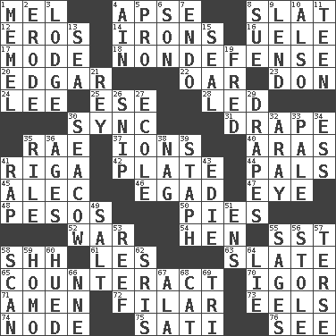 ACROSS 1. Cartoonist voice _ Blanc 4. Domed church section 8. Narrow board 12. Greek god of love 14. Removes the wrinkles 16. Ubangi River tributary 17. Method 18. Unrelated to defense, as in spending 20. _ Allan Poe 22. Boat paddle 23. Spanish title 24. Area sheltered from the wind 25. Compass dir. 28. Directed 30. Synchronize (abbr.) 31. Window treatment 35. Actress Charlotte 37. Charged particles 40. Caspian sea tributary 41. Port city in Latvia 42. Food holder 44. Friends 45. Actor Baldwin 46. Mild oath 47. Sight organ 48. Mexican monetary units 50. Sliced desserts 52. Armed conflict 54. Layer 55. Fast jet (abbr.) 58. Quiet! 61. French article 63. Chalkboard 65. Neutralize 70. Composer Stravinsky 71. So be it 72. Having threads 73. Snakelike fish 74. Thickened enlargement 75. Suttee (variant) 76. Observe DOWN 1. Klaipeda city 2. Wear away 3. Inn 4. The 18th letter of the Arabic alphabet 5. Adept person 6. Male offspring 7. Inside; within (prefix) 8. Take to court 9. Grant temporary use of 10. In addition 11. Adolescent 13. Ocean 15. Lick closed 19. Flintstone 21. Marina Del _, California 26. Clip 27. Learning spot: Fr. 29. Window treatments 30. Manatee 32. Like ___ of sunshine 33. Light colored 34. Double-curved letter 35. Cause heat under the collar 36. Grows older 38. Tired old horse 39. Staphylococcus 41. Hit sharply and swiftly 43. Singer Brickell 49. Table seasoning 51. Followers of ems 53. Coral collection 55. Gurus 56. Fur scarf 57. Laconic 58. Examine minutely or intensely 59. Like (prefix) 60. Took on color 62. Indian titles of respect 64. Falsehood 66. Compass dir. 67. Chicken ___ king 68. Feline 69. Three (prefix)