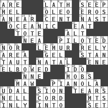 ACROSS 1. "We ___ not amused" (Victoria) 4. Thin strip of wood or metal 8. Ooze 12. Cartoonist voice _ Blanc 13. Margarine 14. Greek god of love 15. Approach 18. Penny 19. Political cartoonist Thomas 20. Pertaining to the sea 22. Ingest 23. Carry 24. The first octave above the treble staff 25. Teachers' org. 26. Manned the helm 30. Or not 33. Arboreal primate 36. Depend 37. Type of rug 39. Set 40. Comedian Laurel of Laurel & Hardy 41. Pulled tight 42. Brizilian seaport 44. Compass dir. 45. Shoved, as through a crowd 47. Wedding promise 50. Compass dir. 51. Crowds into 53. Informal term for the mouth 54. Player piano 57. Freehold land 59. The Jewish people; Israel 61. Lacerates 63. 1994 drama film starring Jodie Foster 64. Drawstring 65. Mountains (abbr.) 66. In an inward manner 67. To the inside or interior of 68. Arrange properly for use DOWN 1. Nursemaid (var.) 2. Western Nevada city 3. Choose 4. Event scenes 5. Actor Baldwin 6. "___ Little Indians" 7. Being at a high temperature 8. Elected representatives 9. Part of Q.E.F. 10. Greek goddess of the dawn 11. Pacific Standard Time (abbr.) 16. A really long time 17. Pace 21. Anneal 22. Pipe bend 24. Atmosphere 26. Monetary unit of Botswana 27. False hair 28. Style 29. Centimeter-gram-second unit of force 30. Nathan's nickname 31. Spoken 32. Reuben's nickname 34. Mild oath 35. Was introduced to 38. Lacking a tonal center or key 42. Born 43. Pale green bean 46. Compass dir. 48. Do not 49. Mitch Miller's instrument 52. Hits or strikes with great force 53. Shopping center 54. Sweet dark-red dessert wine 55. _ china 56. Johnson of "Laugh-In" 57. University (slang) 58. Lair 59. _-fi 60. Electrically charged atom 62. Fast jet (abbr.)