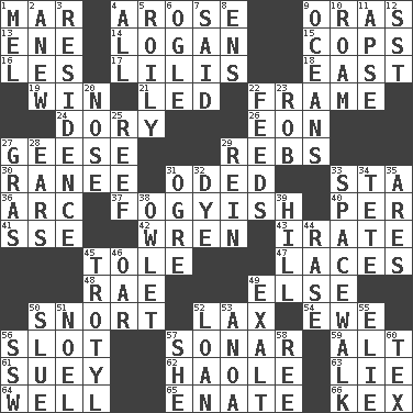 ACROSS 1. Spoil 4. Came up 9. Mouths or openings 13. Compass dir. 14. Utah city north of Ogden 15. 911 reaches them 16. French article 17. Ms. Damita and namesakes 18. Compass direction 19. Victory 21. Directed 22. Movie unit 24. Small, narrow, flatbottom fishing boat 26. A really long time 27. Honkers 29. Confederate soldiers (slang) 30. The wife of a rajah (variant) 31. Wrote a lyric poem 33. R.R. building 36. Curve 37. Out of fashion; old fashioned 40. For each 41. Compass dir. 42. Songbird 43. Feeling or showing extreme anger 45. Lacquered or enameled metalware 47. Shoestrings 48. Actress Charlotte 49. Otherwise 50. Derisive sound 52. Not strict 54. She-sheep 56. Narrow, elongated depression 57. Echolocation 59. Keyboard modifier key 61. Chop _ 62. White Person, in Hawaii 63. Untruth 64. Not ill 65. Related on the mother's side 66. A weed DOWN 1. Cartoonist voice _ Blanc 2. Afresh 3. Dwelling 4. 100% 5. Turbulent 6. Stare at amorously 7. Alleged 8. Followers of ems 9. Seas 10. Wander 11. Domed church section 12. Fast jet (abbr.) 20. Olfactory organ 22. Eats 23. Director Reiner 25. Coral ridge 27. Pate de foie ____ 28. Hearing organs 29. It's straight from the horse's mouth 31. Legendary monster 32. Color 33. High altitude stroll 34. False hair 35. Ancient Greek god of war 38. A small or young owl 39. Land elevation 44. To erase 45. TNT 46. Boat paddle 49. Honor 50. Turn sharply 51. Christmas carol 52. Grant temporary use of 53. Small Philippine buffalo 55. Writer Wiesel 56. Compass dir. 57. A female animal or person 58. To separate or throw off 60. John Ritter's dad