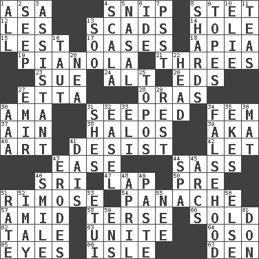 ACROSS 1. White ___ sheet 4. Sever or remove by pinching or nipping 8. Proofreading order 12. French article 13. Heaps 14. Opening into or through something 15. For fear that 17. Fertile tracts in a desert 18. Capital of Western Samoa 19. Player piano 21. Triads 23. Institute legal proceedings 24. The first octave above the treble staff 26. Begley and Asner 27. Singer James 28. Mouths or openings 30. Housemaid (var.) 31. Oozed 34. Opposite of masc. 37. The 18th letter of the Arabic alphabet 38. Radiant circles of light 39. Alias (abbr.) 40. Tate display 41. Stop 42. Allow 43. Comfort 44. Backtalk 46. _ Lanka 47. Infant locale 50. Before (prefix) 51. Full of chinks, cracks, or crevices 54. Flamboyance 57. Among 58. Laconic 60. Disposed of to a purchaser 62. Falsehood 63. Join together 64. Bear (Spanish) 65. Snake ____ (dice throw) 66. Small island 67. Lair DOWN 1. 100% 2. Ooze 3. Helper 4. Any of the three canals of the cochlea 5. Relating to the nose 6. Binary compound 7. Inconspicuous attention getter 8. Pottery fragments 9. Drinks excessively 10. Writer Wiesel 11. Beverages made from leaves 13. "Barney Miller" actor Jack 16. Drawn tight 20. Teachers' org. 22. Froth on beer 25. Literary convention 27. Independent ruler or chieftain 29. Take ten 30. Auto club (abbr.) 31. "______ My Girl" (Turtles hit) 32. Artist's stand 33. Connecticut Ivy Leaguer 34. It jiggles the polygraph 35. Supplements with great effort 36. Floor covering 41. Raised platform 43. Eats (away) 44. Health resort 45. Curves 46. Grin 48. Showery time 49. Thick mixture 51. Assign a rank or rating to 52. "If ____ say so..." 53. Needle holder 55. Born 56. Otherwise 59. Followers of ems 61. Spanish title