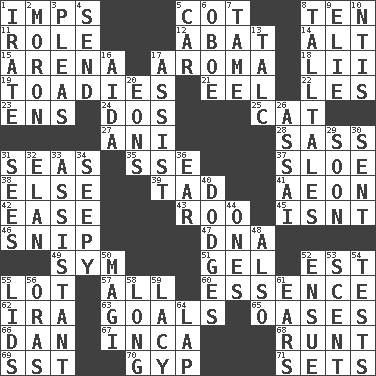 ACROSS 1. Naughty children 5. Small bed 8. Nine, plus one 11. Hero or heavy, e.g. 12. Blind as ____ 14. The first octave above the treble staff 15. Sports stadium 17. Scent 18. Cards in a Roman deck? 19. Sycophants 21. Snakelike fish 22. French article 23. Followers of ems 24. Two (Sp.) 25. Domesticated feline 27. Black tropical American cuckoo 28. Backtalk 31. Oceans 35. Compass dir. 37. A type of plum 38. Otherwise 39. Bit 41. Period of immesurable duration 42. Relaxation 43. Friend of Pooh 45. Is not 46. Clip 47. Heredity factor (abbr.) 49. Symbol (abbr.) 51. Set 52. Eastern Standard Time (abbr.) 55. Car dealer's back yard 57. 100% 60. Center 62. Lyricist Gershwin 63. Scores awarded for successful feats 65. Fertile tracts in a desert 66. Daniel's nick name 67. South American Indian 68. Undersized animal 69. Fast jet (abbr.) 70. Flimflam 71. Puts into a specified state DOWN 1. Feeling or showing extreme anger 2. Person of subnormal intelligence 3. Entreaties 4. Transmit 5. 4-wheeled motor vehicle 6. Mitch Miller's instrument 7. Docile 8. Baron Munchausen's specialties 9. Writer Wiesel 10. Nuclear Threat Initiatives 13. Baby powder 16. Opera by Verdi 17. Help 20. Immeasurably long periods of time 26. Slender Brazilian palm 29. Within a short period 30. Emitted 31. Perceives with the eye 32. Liveliness 33. Helper 34. Oozy 36. Hearing organ 40. Evades 44. Washington bills 48. In addition 50. Wise men 52. Take place subsequently 53. Aroma 54. Trials 55. Hats (slang) 56. Mouths or openings 58. Protracted 59. Made of lace 61. Hearing organs 64. Infant locale