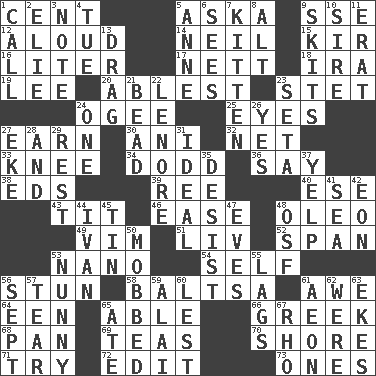 ACROSS 1. Penny 5. "____ silly question..." 9. Compass dir. 12. Verbally 14. Famous astronaut Armstrong 15. Apertif with cassis 16. 61 cubic inches 17. Remaining after all deductions 18. Retirement account (abbr.) 19. Area sheltered from the wind 20. Most capable 23. Proofreading order 24. Double curve, resembling the letter S 25. Sight organs 27. Merit 30. Black tropical American cuckoo 32. Fish or hair follower 33. Leg joint 34. Texas town _ City 36. Declare 38. Begley and Asner 39. To sift 40. Compass dir. 43. Teat (slang) 46. Comfort 48. Margarine 49. Zeal 51. 54 in ancient Rome 52. Connect, as a bridge 53. Billionth: prefix 54. Itself 56. Make senseless or dizzy 58. Greek mezzo-soprano Agnes 61. Deep reverence 64. Car or cant ending 65. Competent 66. Of Greece 68. Baking dish 69. Beverages made from leaves 70. Dinah or Pauly 71. Attempt to accomplish something 72. Prepare for publication 73. Singles DOWN 1. Give a ring to 2. Writer Wiesel 3. Musical sound 4. Third day of the wk. 5. Singer Murray 6. Perceives with the eye 7. Baby cat 8. The first octave above the treble staff 9. Burlesque acts 10. The founder of a family 11. Part of Q.E.F. 13. To trail on the ground 21. Necklace unit 22. Poe poem 23. Bristle 24. Single 26. Affirmative reply 27. Make supply last 28. Plus 29. Relief 31. Standard of perfection 35. Stop 37. Sharp bark 41. Ocean 42. Age 44. _ the terrible 45. Shallow baking pan 47. Nights before holidays 48. Order of Saint Francis (abbr.) 50. Crowded into 53. Pet term 55. Falls behind 56. Back-to-school mo. 57. Pull into pieces 59. Jai _ 60. For fear that 61. Age 62. We are 63. Makes supply last 65. Had dinner 67. 17th letter of the Greek alphabet