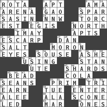 ACROSS 1. Round or rotation of duties 5. Fitting 8. Nursemaid (var.) 11. Sports stadium 13. E Mali city 14. Practice fight 15. Indian antelope 16. Compass dir. 17. Torque (variant) 18. Eastern Standard Time (abbr.) 19. The front part of a cuirass 21. Compass direction 22. "If ____ say so..." 24. Tenement units (abbr.) 25. Fortification 27. Daniel's nick name 29. Table seasoning 30. Person of subnormal intelligence 32. Sight organs 33. Lush 35. American tennis player Robert 39. Exploiting 41. Comedian Laurel of Laurel & Hardy 42. Shoshoni 43. Pottery fragments 45. Necklace unit 48. Root beer relative 49. Actors Connery and Penn 50. Demure 52. Three (prefix) 55. Merit 56. Third day of the wk. 57. Keyboard key 59. Toward shelter 60. Insect wing 61. Biscuitlike quick bread 62. Directed 63. Third mo. 64. Washington bills DOWN 1. Raze (variant) 2. Mouths or openings 3. A testis 4. Black tropical American cuckoo 5. Hindu god of fire 6. Baking dishes 7. Pull behind 8. To the left, to Queeg 9. Shops 10. Bowlike part 12. Approach 14. Cease 20. Con 21. Billionth: prefix 23. Taiwanese island in East China Sea 25. Compass dir. 26. Declare 27. Two (Sp.) 28. "We ___ not amused" (Victoria) 30. Large cup 31. Rhinal 33. Be seated 34. Single 36. Ski resort town in Vermont 37. Possessed 38. Followers of ems 40. Soap bubbles 43. _-fi 44. Residences 45. Calif. Air Force Base 46. Having ears or earlike features 47. Singer Murray 49. Lick closed 50. Monetary unit of Botswana 51. Rump 53. French philosopher Descartes 54. Angers 56. Scottish cap 58. Non-commissioned officer (abbr.)