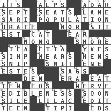 ACROSS 1. ___ a Wonderful Life 4. High mountains 8. The sixth month of the Jewish calendar 12. Back-to-school mo. 14. Theater features 16. Unable to walk 17. Indian skirt 18. Census information 20. A salt of uric acid 22. And not 23. Be seated 24. Eastern Standard Time (abbr.) 25. Domesticated feline 28. Ewer handle 30. Words to Nanette 31. Dinah or Pauly 35. Beverage made from leaves 37. Singer James 40. Jacques Cousteau's middle name 41. Simple or foolish person 42. Puts on (as clothing) 44. Not women's 45. Clip 46. Stricken, poetically 47. Compass dir. 48. _____ Park, CO 50. Droops 52. Lair 54. Period 55. Consume 58. "___ Little Indians" 61. Greek goddess of the dawn 63. Effrontery 65. The property of being fit to eat 70. Within a short period 71. Drop; flow; fall 72. Pale purple color 73. Prepare for publication 74. Adolescent 75. Native american tent (variation) 76. Begley and Asner DOWN 1. Come out of 2. Pulls into pieces 3. Small fatty European fish 4. Cleo's killer 5. Lion 6. Infant food 7. Astound 8. The first octave above the treble staff 9. Raised platform 10. Mine, in Marseilles 11. Monthly bill 13. Teat (slang) 15. _ gin 19. Caspian sea tributary 21. Environmental prefix 26. Afresh 27. Hauls 29. Poems 30. Slept 32. Baking chamber 33. French philosopher Descartes 34. Double-curved letter 35. Canisters 36. Give off 38. Scottish cap 39. Originate 41. Compass dir. 43. Play the lead 49. Sew up the eyelids of hawks and falcons 51. Separate the seeds from cotton 53. Christmas carol 55. Eat (away) 56. Stay clear from 57. Portable shelters 58. Trial 59. Singer Brickell 60. Mediterranean tributary 62. In a ____ (agitated or irritated) 64. Compass dir. 66. Benjamin's nick name 67. Connecticut Ivy Leaguer 68. Plant excrement 69. _-fi