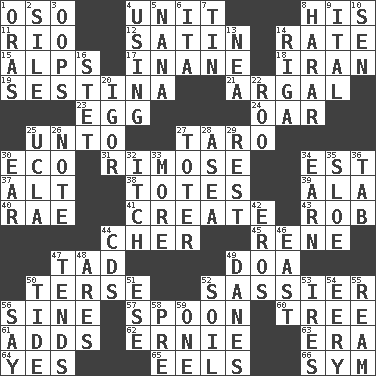 ACROSS 1. Bear (Spanish) 4. A single undivided whole 8. Part of HMS, perhaps 11. _ de Janeiro 12. Smooth fabric 14. Pace 15. High mountains 17. Lacking in sense or substance 18. SW Asia republic 19. French poetic form 21. Therefore, facetiously 23. Oval reproductive body of a fowl 24. Boat paddle 25. To (old English) 27. Pacific island yam 30. Environmental prefix 31. Full of chinks, cracks, or crevices 34. Eastern Standard Time (abbr.) 37. The first octave above the treble staff 38. Lugs 39. Insect wing 40. Actress Charlotte 41. Make 43. Director Reiner 44. "Mermaids" star 45. French philosopher Descartes 47. Small boy 49. ___ good deed 50. Laconic 52. More impudent 56. Trig term 57. Soup utensil 60. Family _ (genealogy) 61. Does sums 62. Bert's buddy 63. Epoch 64. It is so 65. Snakelike fish 66. Symbol (abbr.) DOWN 1. Mouths or openings 2. Filth; sediment 3. I made a mistake 4. Putting into practice 5. Nanny 6. Call ___ day 7. Shallow baking pan 8. Ethiopian city, capital of Harari 9. Slanted text style (abbr.) 10. Elected rep. 13. Teachers' org. 14. Capital of Latvia 16. Proofreading order 20. Russian composer Stravinsky 22. Friend of Pooh 25. Southern CA. univ. 26. Make mention of 27. Carrier 28. At sea 29. Remainder 30. Hearing organ 32. Hankering 33. Greater amount 34. Merit 35. _ gin 36. Keyboard key 42. Greek god of love 44. Music discs 46. 90 degrees 47. Is inclined (to) 48. Ancient Greek god of war 49. Natives or inhabitants of Denmark 50. Periodic rise and fall of the sea level 51. Compass dir. 52. Earth 53. Angers 54. Suggestive of the supernatural 55. 480, 500 or 516 sheets of paper 56. Declare 58. Before (prefix) 59. Single