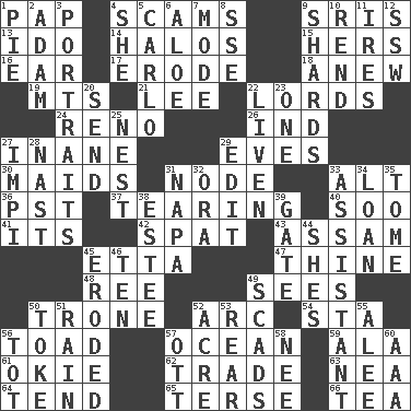 ACROSS 1. Infant food 4. Fraudulent business schemes 9. Indian titles of respect 13. Wedding promise 14. Rings 15. Possessive pronoun 16. Hearing organ 17. Wear away 18. Afresh 19. Mountains (abbr.) 21. Area sheltered from the wind 22. Nobles 24. Western Nevada city 26. Indiana (abbr.) 27. Lacking in sense or substance 29. Nights before holidays 30. Women servants 31. Connecting point 33. The first octave above the treble staff 36. Pacific Standard Time (abbr.) 37. Pulling into pieces 40. "Barney Miller" actor Jack 41. ___ a Wonderful Life 42. Petty quarrel 43. Indian state 45. Singer James 47. One or ones belonging to thee 48. To separate or throw off 49. Observes 50. Heavy duty weighing machine 52. Curve 54. R.R. building 56. Frog relative 57. Sea 59. In the manner of 61. Migrant worker of the '30s 62. Swap 63. Teachers' org. 64. Watch over 65. Laconic 66. Afternoon social gathering DOWN 1. Sliced dessert 2. First of billions? 3. Likenesses of persons 4. A female animal or person 5. Monte _, Las Vegas Hotel/Casino 6. _ vera 7. Method 8. Compass dir. 9. Broken pieces 10. Tear apart 11. Angers 12. Compass dir. 20. Transmit 22. Make or become more lively 23. Single 25. Egg locale 27. Body of Kaffir warriors 28. Political cartoonist Thomas 29. Prepare for publication 31. California wine valley 32. Mouth or opening 33. Aide 34. Grant temporary use of 35. Heavy book 38. First name in cosmetics 39. Yard entry 44. "______ My Girl" (Turtles hit) 45. Worn away 46. "___ Little Indians" 49. Loads 50. Puff or smoke 51. Precipitation 52. 1/640 square mile 53. Bring up, as a child 55. Toward shelter 56. Small child 57. Baseball player Mel 58. Born 60. Auto club (abbr.)