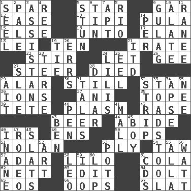 ACROSS 1. Coast Guard woman 5. Play the lead 9. Slender fish 12. Comfort 13. Native american tent (variation) 14. Monetary unit of Botswana 15. Otherwise 16. To (old English) 17. Liveliness 18. Flowery wreath 19. Nine, plus one 21. Feeling or showing extreme anger 22. Commotion 24. Allow 26. Unit of force equal to gravity 27. Bull 28. Passed on 29. Having or resembling wings 30. Free of sound 32. Comedian Laurel of Laurel & Hardy 36. Charged atoms 37. Black tropical American cuckoo 38. Drink excessively 39. False hair 40. Suffix with ecto or cyto 42. Raze (variant) 43. Fermented drink made from hops 44. Stay 46. Big collection agency 49. Followers of ems 50. Chops off 51. Pitcher Ryan 53. Travel a route regularly 54. The 23rd letter of the Hebrew alphabet 57. The sixth month of the Jewish calendar 58. _ and Stitch 61. Root beer relative 62. Remaining after all deductions 63. Prepare for publication 64. Dunce 65. Greek goddess of the dawn 66. I made a mistake 67. Narrow board DOWN 1. Stitch closed the eyes of (a falcon) 2. Light colored 3. Aide 4. Portuguese money of account (variant) 5. Surprise greatly 6. Shallow baking pan 7. Fitting 8. River (Sp.) 9. POW camp 10. Having winglike extensions 11. Indian princess (variant) 14. For each 19. Neckwear 20. Blunders 21. It would 23. Laconic 24. Ms. Damita and namesakes 25. Snakelike fish 27. A type of plum 28. Middle Eastern gold or silver currency 29. Small island 31. Stories 32. Long narrow piece of something 33. Inedible or poisonous agaric 34. Domed church section 35. Born 40. Animal enclosure 41. Shopping center 43. Benjamin's nick name 45. Male child 46. Empty; void 47. Cowboy competition 48. Narrow boards 52. Nonscientific branch of learning 53. Plant holders 55. Silent film actress Nazimova 56. Electrical Unit 58. Lion 59. Wedding promise 60. Mouth edge 61. Music discs