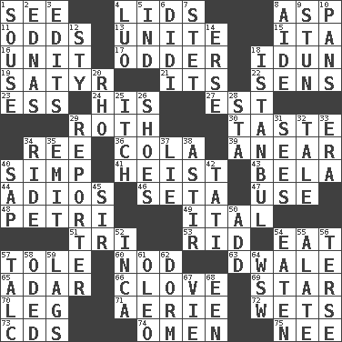 ACROSS 1. Perceive with the eye 4. Hats (slang) 8. Cleo's killer 11. Probability 13. Join together 15. Call ___ day 16. A single undivided whole 17. More peculiar 18. Goddess of spring and wife of Bragi 19. Man with strong sexual desires 21. ___ a Wonderful Life 22. Elected reps. 23. Double-curved letter 24. Part of HMS, perhaps 27. Eastern Standard Time (abbr.) 29. Writer of Portnoy's Complaint (1969) 30. Clothes sense 34. To riddle 36. Root beer relative 39. Approach 40. Simple or foolish person 41. Robbery 43. Actor Lugosi 44. Goodbye (Sp.) 46. Stalk of a moss capsule 47. Purpose 48. _ dish (used to culture cells) 49. Slanted text style (abbr.) 51. Three (prefix) 53. To free from 54. Consume 57. Lacquered or enameled metalware 60. Dreamland 63. A sleeping potion; an opiate (poet.) 65. The sixth month of the Jewish calendar 66. Garlic unit 69. Play the lead 70. Part of a journey 71. Nest on high 72. Soaks 73. Music discs 74. Presage 75. Born DOWN 1. Lush 2. Ferber et al. 3. Prepares for publication 4. Nilotic language 5. Indiana (abbr.) 6. "You Light Up My Life" star Conn 7. Proofreading order 8. Assistant 9. Surprise greatly 10. Zero-star reviews 12. Filthy place 14. Celtic language 18. Byzantium, centuries later 20. 17th letter of the Greek alphabet 25. Hankering 26. Imelda's hoard 28. R.R. building 29. News announcer 31. Perceives with the eye 32. Story 33. Period 34. Travel on an animal 35. Send forth 37. Falsehood 38. Moving about 40. Plant excrement 42. Jacques of French films 45. Title for a knight 50. Find the sum of 52. South American Indian 54. Eroded 55. Having winglike extensions 56. Laconic 57. Baby powder 58. Wrote a lyric poem 59. Straggles 61. Butter sub 62. Dormintory (informal) 64. Compass dir. 67. Compete 68. Car or cant ending