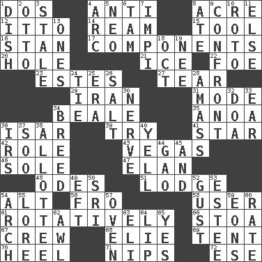 ACROSS 1. Two (Sp.) 4. Opposed to 8. Measure of real estate 12. "Tell ____ the Marines!" 14. 480, 500 or 516 sheets of paper 15. Instrument 16. Comedian Laurel of Laurel & Hardy 17. Parts 20. Opening into or through something 21. Frozen water 22. Enemy 23. _____ Park, CO 27. Pull apart 29. SW Asia republic 31. Method 34. Calif. Air Force Base 35. Small Philippine buffalo 36. Austrian river, tributary to the Danube 39. Attempt 41. Play the lead 42. Hero or heavy, e.g. 43. Viva Las _ 46. Not divided or shared with others 47. Enthusiasm 48. Lyric poems 51. Cabin 54. The first octave above the treble staff 56. Back 58. One who makes use of a thing 61. Producing rotation 66. Portico 67. Ship's personnel 68. Writer Wiesel 69. Portable shelter 70. The bottom of a shoe or boot 71. Cuts off 72. Compass dir. DOWN 1. Food container 2. Von Bismarck 3. Showing deterioration from age 4. Curve 5. Modern: prefix 6. Scottish cap 7. Body of Kaffir warriors 8. Had dinner 9. Meet 10. Printing process, for short 11. Otherwise 13. Singles 18. Sep. follower 19. Born 24. Neckwear 25. Epoch 26. Table seasoning 28. Collect or gather 30. Impudent aggressiveness 32. ___ good deed 33. Ewer handle 34. A special lineage 36. Big collection agency 37. "Barney Miller" actor Jack 38. One to whom something is allotted 40. Shout 44. E Mali city 45. Added to 49. Bank Draft (abbr.) 50. Indian title of respect (Mr.) 52. Abrupt rush of wind 53. First name in cosmetics 54. Bowlike part 55. Old wives' tales, e.g. 57. Baking chamber 59. Immeasurably long periods of time 60. Pace 62. Leather borer 63. Biblical high priest 64. Mouth edge 65. Affirmative reply