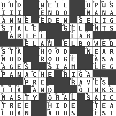 ACROSS 1. Partially opened flower 4. Famous astronaut Armstrong 8. Musical composition 12. One more than two 13. Inside; within (prefix) 14. Nanny 15. Queen of England 1702-14 17. Locale of original sin 18. Major League Baseball Commissioner Bud 19. Showing deterioration from age 21. Set 23. Mountains (abbr.) 24. Satellite of Uranus 26. Experiment locale 28. Flair 30. Shoved, as through a crowd 34. R.R. building 37. Parka part 39. Erode 40. Dreamland 41. Makeup applied to the cheeks 43. White ___ sheet 44. Matures 46. Thailand, formerly 47. Part of a journey 48. Flamboyance 51. Capital of Latvia 54. Before (prefix) 55. All-night dance parties 58. Call ___ day 61. Plus 63. Pig sounds 65. Thoroughly unpleasant 67. Relating to the mouth 71. Ketch in the Levant 72. Relationship diagram 73. Flintstone garb 74. Beverage made from leaves 75. Grant temporary use of 76. Does sums 77. Eastern Standard Time (abbr.) DOWN 1. Prejudice 2. National forest in Provo, Utah 3. Middle Eastern gold or silver currency 4. Born 5. Conclusion 6. Binary compound 7. Yearn 8. Single 9. Inside of hand 10. A single undivided whole 11. Sinks 16. Writer Wiesel 18. Broad, flat, thick piece 20. Snakelike fish 22. Pipe bend 25. Cowardly lion portrayer 27. Ribbon knot 29. Trap for birds or small mammals 30. _ Allan Poe 31. Welt 32. Comfort 33. To draw with force 34. Fastener 35. Ancient Roman robe 36. An important port of Yemen 38. Fr. "Yes" 42. Independent ruler or chieftain 45. Plant excrement 49. Supercomputer manufacturer 50. Layer 52. E Mali city 53. Deliberation 56. Maternal 57. Atmospheres 58. International (abbr.) 59. Edible starchy tuberous root 60. At sea 62. Capital of the state of Qatar 64. Get outta here! 66. "___ Little Indians" 68. To free from 69. Find the sum of 70. French article