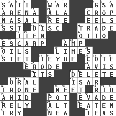 ACROSS 1. Suttee (variant) 5. Armed conflict 8. Girls' org. (abbr.) 11. Sports stadium 13. According to 14. Riding implement 15. Relating to the nose 16. To sift 17. Snakelike fish 18. Fast jet (abbr.) 19. Compact _ 21. Swap 22. Detail 24. Von Bismarck 25. Fortification 27. Electrical Unit 29. Lubricates 30. Citrus fruits 32. Proofreading order 33. Miss Universe 1986, Barbara Palacios _ 35. ____ d'Azur (French Riviera) 39. Wear away 41. Opinion 42. It is 43. Erase 45. Taken by mouth 48. Austrian river, tributary to the Danube 49. Heavy duty weighing machine 50. Rendezvous 52. To free from 55. Among 56. Plant holder 57. Elude 59. Have confidence or faith in 60. Keyboard modifier key 61. Eroded 62. Attempt 63. Teachers' org. 64. Afternoon social gatherings DOWN 1. Without 2. Caspian sea tributary 3. A testis 4. _ tizzy (2 wds.) 5. Armed conflicts 6. Actor Baldwin 7. Actress Charlotte 8. Relatively large 9. Twentieth part of a lira 10. Domed church section 12. Tree or shrub in the Birch family 14. Foregone conclusion 20. Mischievous child 21. Drink excessively 23. Clothes sense 25. Greek goddess of the dawn 26. Be seated 27. Help 28. Madame (abbr.) 30. Sodium hydroxide 31. Any of the three canals of the cochlea 33. Small child 34. Begley and Asner 36. Make much ado about nothing 37. Teat (slang) 38. Compass dir. 40. Cause heat under the collar 43. Pass on 44. First name in cosmetics 45. Channel Islands abalone 46. Agitated, as a liquid 47. "60 Minutes" Commentator Rooney 49. Small pie 50. Undercover agent 51. Singer James 53. It may be bright or harebrained 54. Habitations of wild animals 56. Baking dish 58. Large container