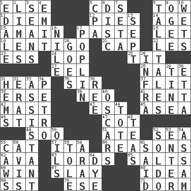 ACROSS 1. Otherwise 5. Music discs 8. Pull behind 11. South Vietnam president (1954) 12. Sliced desserts 14. Mature 15. At full speed 17. Thick mixture 18. Allow 19. Small, flat, pigmented spot on the skin 21. Head covering 22. French article 23. Curvy letter 24. Chop off 25. Teat (slang) 27. Snakelike fish 28. Nathan's nickname 31. Pile 35. Title for a knight 37. Sudden quick movement 38. Celtic language 39. Modern: prefix 41. Monthly bill 42. Vertical spar for supporting sails 43. Eastern Standard Time (abbr.) 45. Toward the sea 46. Commotion 47. Small bed 49. "Barney Miller" actor Jack 51. Had dinner 52. Ocean 55. Feline 57. Call ___ day 60. Thinks logically 62. Actress Gardner 63. Domineers 65. Table seasonings 66. Acquire through effort 67. Kill 68. The main thing one is thinking about 69. Fast jet (abbr.) 70. Compass dir. 71. Dormintory (informal) DOWN 1. Peak District village in England 2. Citrus fruits 3. Actors Connery and Penn 4. Send forth 5. Numbers guy (abbr.) 6. Plate 7. Stalk of a moss capsule 8. Baron Munchausen's specialties 9. Double curve, resembling the letter S 10. Moistens 13. Back-to-school mo. 16. "Death on the ____" 17. Cotton for raincoats, e.g. 20. Moves 26. Kind of red light 29. Prong on a fork 30. Singer James 31. Cloth borders 32. Part of Q.E.F. 33. Aide 34. Stone: prefix 36. To riddle 40. Motion picture awards 44. Carry 48. Afternoon social gatherings 50. Petroleums 52. Twentieth part of a lira 53. Keyboard key 54. Indian state 55. Crow sounds 56. Advice 58. Lacquered or enameled metalware 59. Ancient river in northeast Turkey 61. Expressed in words 64. Color