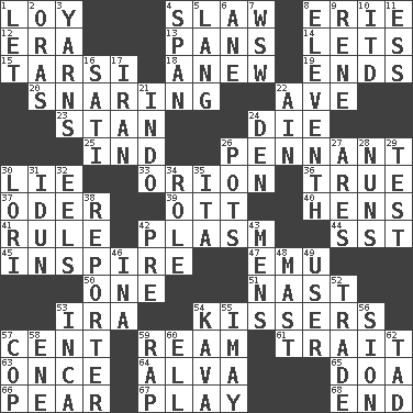 ACROSS 1. Myrna of the movies 4. Cole _ (cabbage dish) 8. One of the Great Lakes 12. Epoch 13. Zero-star reviews 14. Allows 15. Tarsus (plural) 18. Afresh 19. Conclusions 20. Catching in a trap 22. "___ Maria" 23. Comedian Laurel of Laurel & Hardy 24. Pass on 25. Indiana (abbr.) 26. Pre-World Series prize 30. Untruth 33. Greek mythologigal hunter 36. Loyal 37. Baltic tributary 39. Baseball player Mel 40. Coop moms 41. Court order 42. Suffix with ecto or cyto 44. Fast jet (abbr.) 45. Motivate 47. Australian flightless bird 50. Single 51. Political cartoonist Thomas 53. Retirement account (abbr.) 54. Smoochers 57. Penny 59. 480, 500 or 516 sheets of paper 61. Distinguishing feature 63. Single time 64. Inventor's middle name 65. ___ good deed 66. Lightbulb-shaped fruit 67. Frolic 68. Conclude DOWN 1. Allow 2. Mouths or openings 3. Entertaining tales 4. Connect, as a bridge 5. Austrian-born American filmmaker Fritz 6. A saturated hydrocarbon 7. Compass dir. 8. Veterans Day date 9. French philosopher Descartes 10. It would 11. Curvy letter 16. Suttee (variant) 17. SW Asia republic 21. _ china 22. The 18th letter of the Arabic alphabet 24. Lair 26. Cooking vessels 27. Ancient Greek god of war 28. Religious women 29. Trial 30. Australian parrot (variant) 31. Goddess of spring and wife of Bragi 32. Snakelike fish 34. Hero or heavy, e.g. 35. Call ___ day 38. Newsperson 42. Before (prefix) 43. Not women's 46. _ tizzy (2 wds.) 48. Vertical spar for supporting sails 49. One who uses or employs something 52. Barter 53. South American Indian 54. Polynesian shrub of the pepper family 55. "If ____ say so..." 56. The Jewish people; Israel 57. Police officer (slang) 58. Compass dir. 59. Reproach for some lapse or misdeed 60. Pipe bend 62. Small boy