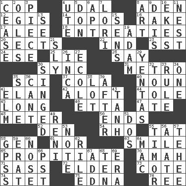 ACROSS 1. Police officer (slang) 4. Hereditary estate 8. An important port of Yemen 12. Armor plate that protects the chest 14. Literary convention 16. Libertine 17. Toward shelter 18. Pleas 20. Religious groups 22. Indiana (abbr.) 23. Fast jet (abbr.) 24. Compass dir. 25. Falsehood 28. Declare 30. Synchronize (abbr.) 31. Paris' subway 35. _-fi 37. Root beer relative 40. Part of speech 41. Flair 42. At or to great height 44. Lacquered or enameled metalware 45. Having great length 46. Singer James 47. Had dinner 48. Distance measurement 50. Extremities 52. Lair 54. 17th letter of the Greek alphabet 55. Make lace 58. Commissioned mil. rank 61. And not 63. Grin 65. Conciliate 70. Nursemaid 71. Backtalk 72. A person who is older than you are 73. ____ d'Azur (French Riviera) 74. Proofreading order 75. Pulitzer Prize-winning author Ferber 76. Portuguese money of account (variant) DOWN 1. Stop 2. Stares at amorously 3. Component 4. Shoshoni 5. Spanish title 6. Fitting 7. Australian parrot (variant) 8. Tate display 9. Raised platform 10. Supplements with great effort 11. A home for chicks 13. Arrange properly for use 15. Elected reps. 19. First of billions? 21. Wily 26. South American Indian 27. Learning spot: Fr. 29. Gossips 30. Burned superficially 32. A blast of a horn 33. General guideline 34. Single 35. A type of plum 36. Patter 38. Car dealer's back yard 39. Following 41. Shade tree 43. Hyperbolic tangent 49. Painter Guido (1575-1642) 51. Two (Sp.) 53. Short letter 55. Southeast Indonesia island 56. Having winglike extensions 57. Giggle 58. Global Positioning Systems (abbr.) 59. Part of Q.E.F. 60. Olfactory organ 62. Cause heat under the collar 64. Apple computer (short form) 66. Pacific Standard Time (abbr.) 67. Say or write further 68. Nine, plus one 69. Epoch