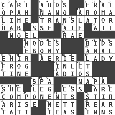 ACROSS 1. Draw slowly or heavily 5. Sums up 9. Part of Q.E.F. 13. Brightly colored fish 14. Billionth: prefix 15. Odor 16. Welles in "The Third Man" 17. Interpreter 19. Apply (a substance) by light strokes 20. Compass dir. 21. Had dinner 22. Small island 23. Christmas carol 25. Actress Charlotte 26. Methods 30. Auction offers 34. Black 35. Of or related to the anus 36. Arab leader 39. Nest on high 42. Kenny Rogers chart-topper in '80 43. Toadlike animal 44. An arm off of a larger body of water 46. Prong on a fork 47. Goodbye (Sp.) 48. Health resort 51. California wine valley 54. A female animal or person 57. Part of a journey 58. Double-curved letter 60. "We ___ not amused" (Victoria) 62. Pieces 65. Tumult 66. Originate 67. Remaining after all deductions 68. Stern 69. Jacques of French films 70. Beverages made from leaves 71. Restaurants DOWN 1. Having a low temperature 2. Bee-related 3. Role for Stallone 4. Definite Article 5. Pismires 6. Have the gumption 7. Heredity factor (abbr.) 8. Echolocation 9. Period 10. Round or rotation of duties 11. Mine, in Marseilles 12. Small pie 15. Toward shelter 18. R.R. building 20. Oscar Madison type 24. Develop 27. ___ good deed 28. Compass dir. 29. Damascus' land 30. Greek mezzo-soprano Agnes 31. _ tizzy (2 wds.) 32. Male parent 33. Secret 36. Bank Draft (abbr.) 37. Medical imaging device (abbr.) 38. Electrically charged atom 40. Indiana (abbr.) 41. Connecticut Ivy Leaguer 45. Immeasurably long periods of time 48. A type of plum 49. Fenced enclosure 50. Rep 52. Eucharist need 53. Believer in; advocate of (suffix) 54. Jazz singing style 55. Israeli folk dance 56. Give off 58. Singer James 59. Fast planes 61. Blunders 63. Air pressure measure (abbr.) 64. Born 65. Indian title of respect (Mr.)