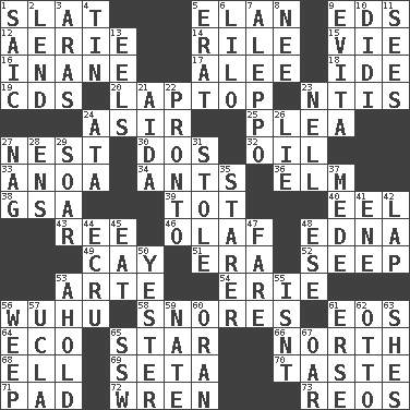 ACROSS 1. Narrow board 5. Style 9. Begley and Asner 12. Nest on high 14. Cause heat under the collar 15. Compete 16. Lacking in sense or substance 17. Toward shelter 18. Binary compound 19. Music discs 20. Portable computer 23. Nuclear Threat Initiatives 24. SW Saudi Arabia district 25. Entreaty 27. A home for chicks 30. Two (Sp.) 32. Lubricate 33. Small Philippine buffalo 34. Pismires 36. Shade tree 38. Girls' org. (abbr.) 39. Small child 40. Snakelike fish 43. To riddle 46. Norwegian king 48. Pulitzer Prize-winning author Ferber 49. Island 51. Epoch 52. Ooze 53. Johnson of "Laugh-In" 54. 4th largest of the Great Lakes 56. Chinese city south-southwest of Nanjing 58. Sounds asleep 61. Greek goddess of the dawn 64. Environmental prefix 65. Play the lead 66. 0 degrees 68. Pipe bend 69. Bristle 70. Clothes sense 71. Groovy apt. 72. Songbird 73. Vintage cars DOWN 1. Ketch in the Levant 2. Grant temporary use of 3. Ancient river in northeast Turkey 4. Metal container 5. Part of Q.E.F. 6. _ and Stitch 7. City in Syria 8. Born 9. Webber/Rice musical 10. "You Light Up My Life" star Conn 11. Observes 13. Snakelike fish 21. Opera by Verdi 22. Right away 23. 1994 drama film starring Jodie Foster 24. _ moment's notice (2 wds.) 26. Untruth 27. Tired old horse 28. Followers of ems 29. Fly high 31. Fur scarf 35. A viewer who gazes fixedly 37. Ancient Persian 41. Compass dir. 42. Infant locale 44. Shade of tan 45. Consume 47. Conductor's collection 48. Compass dir. 50. Of or pertaining to yesterday 53. Hold, grip (Informal) 55. Is not 56. Shed a tear 57. Southern CA. univ. 59. Nathan's nickname 60. NW Algerian seaport 61. Celtic language 62. Von Bismarck 63. "______ My Girl" (Turtles hit) 65. Compass dir. 67. Boat paddle