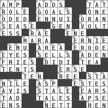 ACROSS 1. Electrical Unit 4. Sums up 8. Make lace 11. Hero or heavy, e.g. 13. Scores awarded for successful feats 15. Single 16. Wrote a lyric poem 17. World-weariness 18. NW Algerian seaport 19. Gospel singer Marvin 21. Commissioned mil. rank 22. Electrical Unit 23. Curvy letter 24. Actress Charlotte 27. Compass dir. 29. Hindu Mythology: god of death 30. Bert's buddy 34. Australian flightless bird 36. Length times width 39. Eat (away) 40. Sight organs 41. Exchanges for money 43. An important port of Yemen 44. Strips of potato fried in deep fat 46. "You Light Up My Life" star Conn 47. Afternoon social gathering 48. Portable shelters 49. Celtic language 51. "___ Little Indians" 53. To sift 54. R.R. building 57. "Death on the ____" 60. Cleo's killer 63. _____ Park, CO 65. Advice 66. Lacking originality or spontaneity 69. Hearing organs 70. Small amount or degree 71. Lies 72. Domed church section 73. Followers of ems 74. Remaining after all deductions 75. Layer DOWN 1. Came up 2. Methods 3. Entreaties 4. Mature 5. Spanish title 6. Mild oath, euphamism for damn 7. Change direction abruptly 8. "Corrida" creature 9. Of or related to the anus 10. Portable shelter 12. Begley and Asner 14. Trig term 18. Make much ado about nothing 20. Epoch 25. Caspian sea tributary 26. Having ears or earlike features 28. Born 29. French bagpipes 31. Thickened enlargement 32. The content of cognition 33. Car or cant ending 34. Jane of fiction 35. Count _ (2 wds.) 37. Biblical high priest 38. Tree or shrub in the Birch family 40. Bank Draft (abbr.) 42. Male parent of an animal 45. Compass dir. 50. Observe 52. Political cartoonist Thomas 54. Staphylococcus 55. Laconic 56. NE Netherlands city 57. Nathan's nickname 58. _ the terrible 59. Hats (slang) 61. Comedian Laurel of Laurel & Hardy 62. Diluted with white 64. Ocean 67. Allow 68. Eastern Standard Time (abbr.)