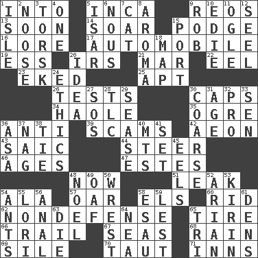 ACROSS 1. To the inside or interior of 5. South American Indian 9. Vintage cars 13. Within a short period 14. Fly high 15. Porridge 16. Old wives' tales, e.g. 17. Form of transportation 19. Double-curved letter 20. Big collection agency 21. Spoil 22. Snakelike fish 23. Made supply last 25. Fitting 26. Trials 30. Smile enhancers 34. White Person, in Hawaii 35. Legendary monster 36. Opposed to 39. Fraudulent business schemes 42. A really long time 43. Ketch in the Levant 44. Bull 46. Eras 47. _____ Park, CO 48. At this time 51. Path through which fluid escapes 54. Chicken ___ king 57. Rowing implement 58. Raised railways 60. To free from 62. Unrelated to defense, as in spending 65. Hoop that covers a wheel 66. Drop behind 67. Oceans 68. Water falling in drops from the sky 69. Filth; sediment 70. Tense 71. Restaurants DOWN 1. Capri or Wright 2. Trap for birds or small mammals 3. Cod relative 4. Single 5. Austrian river, tributary to the Danube 6. Horse sense 7. Feline 8. Scent 9. Director Reiner 10. Singer Brickell 11. Stare 12. Sew up the eyelids of hawks and falcons 15. Sweet dark-red dessert wine 18. Atlas unit 20. The main thing one is thinking about 24. Value system 27. Mayday 28. Affectionate concern, for short 29. Gospel singer Marvin 30. Unrefined 31. Personal question 32. Adept person 33. Elected rep. 36. White ___ sheet 37. Tired old horse 38. Standoff 40. Mountains (abbr.) 41. Arrange properly for use 45. Snakelike fish 48. Christmas carol 49. Clumsy lout 50. Obtain by seizing forcibly or violently 52. Believer in; advocate of (suffix) 53. Japanese brewing company 54. Pismires 55. Australian parrot (variant) 56. Of or related to the anus 58. Son of Isaac 59. For fear that 61. Cub Scout units 63. Pass on 64. Teachers' org. 65. Three (prefix)