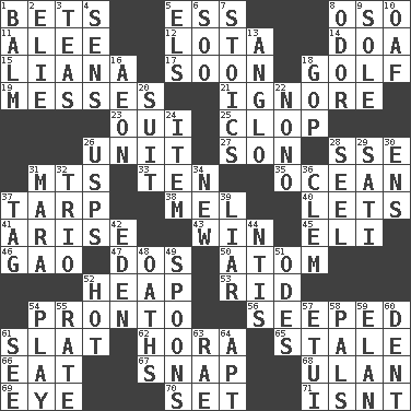 ACROSS 1. Wagers 5. Curvy letter 8. Bear (Spanish) 11. Toward shelter 12. Globular water bottle used in Asia 14. ___ good deed 15. Woody, climbing, usually tropical plant 17. Within a short period 18. _ course 19. Makes clutter 21. Snub 23. Fr. "Yes" 25. Hoof sound 26. A single undivided whole 27. Male offspring 28. Compass dir. 31. Mountains (abbr.) 33. "___ Little Indians" 35. Sea 37. Canvas cover 38. Cartoonist voice _ Blanc 40. Allows 41. Originate 43. Acquire through effort 45. Connecticut Ivy Leaguer 46. E Mali city 47. Two (Sp.) 50. Tiny particle 52. Pile 53. To free from 54. Right away 56. Oozed 61. Narrow board 62. Israeli folk dance 65. Having lost freshness 66. Ingest 67. Fastener 68. ____ Bator, Mongolia 69. Sight organ 70. Put into a specified state 71. Is not DOWN 1. Lip ointment 2. Writer Wiesel 3. Afternoon social gatherings 4. Elected reps. 5. Raised railways 6. "Barney Miller" actor Jack 7. Unemotional ones 8. Scent 9. Flatfish 10. Clumsy lout 13. White American of non-Hispanic descent 16. Period of immesurable duration 18. Republican Party 20. Costume for a special activity 22. Words to Nanette 24. A distinct part 26. United States Postal Service (abbr.) 28. Stitch closed the eyes of (a falcon) 29. Suttee (variant) 30. Followers of ems 31. Hindu Mythology: god of death 32. Musical group of three 34. ___ Haven, CT 36. To starve (Brit.) 37. Label 39. One who doesn't tell the truth 42. Paradise 44. Nuclear Threat Initiatives 48. Profane or obscene expressions 49. Soup utensils 51. Lyric poems 52. Being at a high temperature 54. Live dramatic performance 55. Assign a rank or rating to 57. Needle case 58. Friends 59. Flair 60. Incision 61. Perceive with the eye 63. Actress Charlotte 64. Fitting