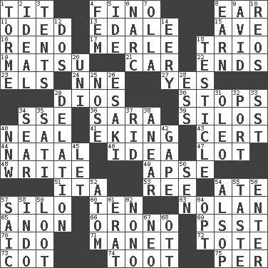 ACROSS 1. Teat (slang) 4. A pale, very dry sherry 8. Hearing organ 11. Wrote a lyric poem 13. Peak District village in England 15. "___ Maria" 16. Western Nevada city 17. Haggard of country music 18. Musical group of three 19. Taiwanese island in East China Sea 21. 4-wheeled motor vehicle 22. Extremities 23. Raised railways 24. Compass dir. 27. Affirmative reply 29. "Vaya con ____" 30. Discontinues 34. Compass dir. 36. "Two Mules for Sister ____" 39. Grain storage towers 40. Be tempered by heat 41. Supplementing with great effort 43. An absolute certainty 44. Relating to or accompanying birth 46. The main thing one is thinking about 47. Car dealer's back yard 48. Compose 49. Domed church section 51. Call ___ day 53. To sift 54. Had dinner 57. Grain storage tower 60. Nine, plus one 63. Pitcher Ryan 65. Soon (poet.) 66. U. of Maine site 69. Inconspicuous attention getter 70. Wedding promise 71. French painter Edouard 72. Haul 73. Small bed 74. A blast of a horn 75. For each DOWN 1. Singer Mel 2. Standard of perfection 3. Portable shelters 4. Opposite of masc. 5. Binary compound 6. Drug cop 7. Water jar 8. Merit 9. Enthusiastic 10. Vintage cars 12. Two (Sp.) 14. Suggestive of the supernatural 18. One of the two male reproductive glands 20. Corn or form start 25. Characteristic smell of wine 26. 1973 Nobel Price Winner (Physics) Leo 28. Double-curved letter 29. Accusation by an informer 31. Butter sub 32. Sweet dark-red dessert wine 33. Fast jet (abbr.) 34. Shrivel 35. Suttee (variant) 37. To free from 38. Approach 40. Compass dir. 42. Stare wonderingly 45. Allow 50. Elected rep. 52. Smallest unit of an element 54. Columnist Joseph or Stewart 55. Clothes sense 56. Keyboard key 57. Ketch in the Levant 58. _ china 59. Plunder 61. Part of Q.E.F. 62. Words to Nanette 64. Elect 67. Modern: prefix 68. Baseball player Mel