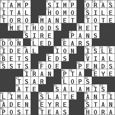 ACROSS 1. Pack (down) 5. Simple or foolish person 9. Mouths or openings 13. Slanted text style (abbr.) 14. Same (prefix) 15. Filth; sediment 16. "Corrida" creature 17. French painter Edouard 18. Carry 19. Modes 21. Was introduced to 22. Male parent of an animal 23. Zero-star reviews 24. Spanish title 27. Directed 28. Hearing organs 29. Perfect 31. Electrically charged atom 32. Small island 36. Antes 37. Begley and Asner 38. Small bottle 39. Fast planes 40. Enemy 41. Hangs 42. SW Asia republic 44. Parent Teacher Assoc. 46. Sight organ 47. Russian ruler of old 48. Chops off 50. Had dinner 51. Deli grouping 54. Pale green bean 56. Schedule 58. Opposed to 60. Arabian gulf 61. Jane of fiction 62. Comedian Laurel of Laurel & Hardy 63. Mail 64. Afternoon social gatherings 65. Israeli folk dance DOWN 1. Teat (slang) 2. Smallest unit of an element 3. Female horse 4. Secret plans 5. Cast a shadow over 6. Charged atoms 7. Madame (abbr.) 8. Plant holder 9. Clearly or manifestly demonstrative 10. Debaucheries 11. The first octave above the treble staff 12. Perceive with the eye 17. Greater amount 20. Land elevation 21. Third mo. 23. Baking dish 24. Rights 25. Lyric poems 26. Remaining after all deductions 28. Greek goddess of the dawn 30. Aide 31. Binary compound 33. Trig term 34. Kenny Rogers chart-topper in '80 35. Otherwise 37. A really long time 40. Distant 41. Dad 43. Actress Charlotte 44. Food holders 45. Lacquered or enameled metalware 47. Corrects by punishment or discipline 49. Box-office sellout 51. "Two Mules for Sister ____" 52. To the inside or interior of 53. Play the lead 54. Infant locale 55. Wedding promise 56. Arrange properly for use 57. Sodium hydroxide 59. _ tizzy (2 wds.)