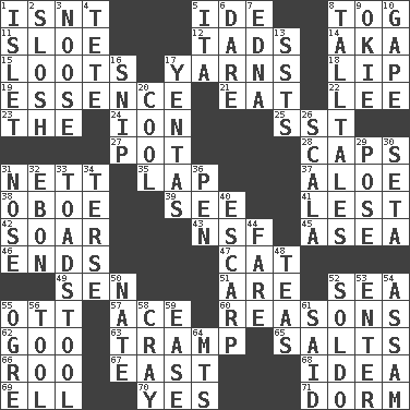 ACROSS 1. Is not 5. Binary compound 8. Coat; cloak 11. A type of plum 12. Small amounts or degrees 14. Alias (abbr.) 15. Plunders 17. Tall tales 18. Mouth edge 19. Gist 21. Erode 22. Area sheltered from the wind 23. Definite Article 24. Electrically charged atom 25. Fast jet (abbr.) 27. Plant holder 28. Balmoral and tarboosh 31. Remaining after all deductions 35. Infant locale 37. _ vera 38. Mitch Miller's instrument 39. Observe 41. For fear that 42. Fly high 43. Science/research agcy. 45. At sea 46. Extremities 47. Feline 49. Elected rep. 51. "We ___ not amused" (Victoria) 52. Ocean 55. Baseball player Mel 57. Adept person 60. Thinks logically 62. Thick or sticky substance 63. _____ steamer (cargo ship) 65. Table seasonings 66. Friend of Pooh 67. Compass direction 68. It may be bright or harebrained 69. Pipe bend 70. Affirmative reply 71. Dormintory (informal) DOWN 1. Small island 2. Splash clumsily 3. Trap for birds or small mammals 4. Wig 5. Call ___ day 6. Have the gumption 7. Pulitzer Prize-winning author Ferber 8. Baron Munchausen's specialties 9. Migrant worker of the '30s 10. Stare wonderingly 13. Fast planes 16. Clip 17. Gossips 20. Calm and collected 26. Any of the three canals of the cochlea 29. Airs 30. Bristle 31. Characteristic smell of wine 32. Inky black, to poets 33. Inedible or poisonous agaric 34. Laconic 36. Writing instrument 40. Fortification 44. Conductor's collection 48. Beverages made from leaves 50. Nathan's nickname 52. Twentieth part of a lira 53. Keyboard key 54. Indian state 55. Legendary monster 56. Instrument 58. Supercomputer manufacturer 59. Comfort 61. Alleged 64. Mountains (abbr.)
