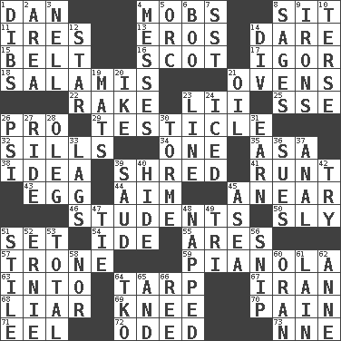 ACROSS 1. One of the 12 tribes of Israel 4. Crowds into 8. Be seated 11. Angers 13. Greek god of love 14. Have the gumption 15. Waist strap 16. Native of Scotland 17. Composer Stravinsky 18. Deli grouping 21. Baking chambers 22. Immoral or dissolute person 23. Cards in a Roman deck? 25. Compass dir. 26. Adept person 29. A testis 32. Beverly of Met fame 34. Single 35. White ___ sheet 38. The main thing one is thinking about 39. Tear up 41. Undersized animal 43. Ovum 44. Direct toward a target or goal 45. Approach 46. SAT takers 50. Stealthy 51. Arrange properly for use 54. Binary compound 55. Ancient Greek god of war 57. Marketplace scale 59. Player piano 63. To the inside or interior of 64. Canvas cover 67. SW Asia republic 68. One who doesn't tell the truth 69. Leg joint 70. Ache 71. Snakelike fish 72. Wrote a lyric poem 73. Compass dir. DOWN 1. Rights 2. Type of rug 3. 1994 drama film starring Jodie Foster 4. Makes clutter 5. The grampus (Milton) 6. Surprise greeting 7. Fast jet (abbr.) 8. Gurus 9. Removes the wrinkles 10. Laconic 12. Play the lead 14. HTML Container Element 19. Floor coverings 20. Eisenhower's nickname 21. Lubricate 23. Actor's bit 24. On the rocks 26. Air pressure measure (abbr.) 27. Travel on or in a vehicle 28. Cassini of fashion 30. Singer Mel 31. Merit 33. Fails to keep up a pace 36. Takes to court 37. Of or related to the anus 39. Saudi Arabian king (1953-1964) 40. Flintstone garb 42. Attempt to accomplish something 45. Toward the sea 47. Neckwear 48. Slept 49. Three (prefix) 51. Vertical member of a panel or frame 52. Bert's buddy 53. "_____ Recall" 56. Clip 58. And not 60. Northwest Algerian city 61. (Had) reclined 62. Singer Murray 64. Ring climax 65. Plus 66. To riddle