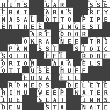 ACROSS 1. Basketball hoops 5. Slender fish 8. Compass dir. 11. Part of Q.E.F. 12. Caspian sea tributary 14. Marina Del _, California 15. Rhinal 17. Von Bismarck 18. Corncob 19. Main course 21. Swallow 23. "We ___ not amused" (Victoria) 25. Aroma 26. Gumbo ingredient 27. Born 28. Three (prefix) 31. Baking dish 33. Fast jet (abbr.) 35. Unemotional 37. Exchanged or delivered for money 38. Snakelike fish 40. Loose flowing garment 41. Constellation of myth 43. Auto club (abbr.) 45. Raised railways 46. Baseball player Mel 47. Purpose 50. Perform or handle clumsily 52. Pulitzer Prize-winning author Ferber 53. Pipe bend 54. Lover boys 56. Keyboard key 61. Tall New Zealand timber tree 62. Shed a tear 65. Wetness 66. Binary compound 67. Narrow board 68. Restaurants 69. Lair 70. R.R. building 71. Nathan's nickname DOWN 1. French philosopher Descartes 2. SW Asia republic 3. Vertical spar for supporting sails 4. Play the lead 5. E Mali city 6. Tate display 7. Food allowance for one day 8. Indian titles of respect 9. Back-to-school mo. 10. Sight organ 13. Something which is sent 16. Path through which fluid escapes 18. For each 20. Blunders 22. Leaves 24. Comfort 26. Southwest Nigerian state 28. Utensil 29. Chest bones 30. Frozen water 31. Left side of a ship or aircraft 32. Came down and settled, as after flight 34. Beverage made from leaves 36. Not kosher 37. "Barney Miller" actor Jack 39. Unable to walk 42. Naked 44. Old (Scot.) 48. Overwhelms 49. Artist's stands 51. Soared 52. Australian flightless bird 54. Travel on or in a vehicle 55. Sign of things to come 57. (Had) reclined 58. Inactive volcano in Sicily 59. Portable shelter 60. Celtic language 61. To free from 63. Ingest 64. Parent Teacher Assoc.