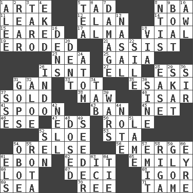ACROSS 1. Johnson of "Laugh-In" 5. Small boy 8. Basketball assoc. 11. Path through which fluid escapes 12. Flair 14. Pull behind 15. Having ears or earlike features 17. _ mater 18. Small bottle 19. Eaten away 21. Aid 23. Teachers' org. 25. Greek goddess of the earth (variant) 26. Is not 27. Pipe bend 28. Curvy letter 31. Separate the seeds from cotton 33. Small child 35. 1973 Nobel Price Winner (Physics) Leo 37. Exchanged or delivered for money 38. Informal term for the mouth 40. Austrian river, tributary to the Danube 41. Soup utensil 43. Prohibit 45. Fish or hair follower 46. Compass dir. 47. Begley and Asner 50. Hero or heavy, e.g. 52. _ gin 53. R.R. building 54. Threatening words 56. Develop 61. Inky black, to poets 62. Prepare for publication 65. Poet Dickinson 66. Car dealer's back yard 67. Tenth: prefix 68. Russian composer Stravinsky 69. Ocean 70. To sift 71. Docile DOWN 1. Toward shelter 2. Posterior 3. Edible starchy tuberous root 4. Supplemented with great effort 5. Beverage made from leaves 6. 100% 7. Break 8. Nuclear Threat Initiatives 9. Water vessel 10. Leather borer 13. Rhinal 16. Hiding places for outlaws 18. By way of 20. Incision 22. Filth; sediment 24. Tiny particle 26. _ china 28. Relaxation 29. Three-handed card game 30. Title for a knight 31. Republicans 32. _ vera 34. Keyboard key 36. Trig term 37. Compass dir. 39. Armed conflicts 42. 1994 drama film starring Jodie Foster 44. Observe 48. Administered medicine 49. Sowing specialist 51. Unable to walk 52. Elected rep. 54. Mitch Miller's instrument 55. Roll call or roster of names 57. Send forth 58. Port city in Latvia 59. Take by theft 60. Jane of fiction 61. Raised railways 63. Frozen water 64. Standoff