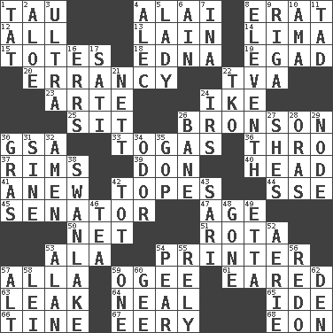 ACROSS 1. The 19th letter of the Greek alphabet 4. Jai _ 8. Part of Q.E.F. 12. 100% 13. (Had) reclined 14. Pale green bean 15. Hauls 18. Pulitzer Prize-winning author Ferber 19. Mild oath 20. The state or an instance of erring 22. Federal power corp. 23. Johnson of "Laugh-In" 24. Mamie's mate 25. Be seated 26. "Death Wish" actor 30. Girls' org. (abbr.) 33. Ancient Roman robes 36. Through, poetically 37. Basketball hoops 39. Spanish title 40. Froth on beer 41. Afresh 42. Drinks excessively 44. Compass dir. 45. Legislator 47. Ripen 50. Fish or hair follower 51. Round or rotation of duties 53. Wing 54. Hard copy producer 57. Silent film actress Nazimova 59. Double curve, resembling the letter S 61. Having ears or earlike features 63. Path through which fluid escapes 64. Actress Patricia 65. Binary compound 66. Prong on a fork 67. Suggestive of the supernatural 68. Period of immesurable duration DOWN 1. Make lace 2. _ vera 3. Extreme 4. Actor Baldwin 5. Kenny Rogers chart-topper in '80 6. The 18th letter of the Arabic alphabet 7. _ tizzy (2 wds.) 8. Veterans Day date 9. Capital of Latvia 10. Housemaid (var.) 11. Small boy 16. Blunders 17. Suttee (variant) 21. Remaining after all deductions 22. Ring climax 24. Big collection agency 26. Object of repulsion 27. "______ My Girl" (Turtles hit) 28. Mouths or openings 29. Connecting point 30. Pate de foie ____ 31. Trig term 32. So be it 34. Scent 35. Grand Old Party 38. Tchaikovsky ballet 42. Small child 43. Indian skirt 46. Beverage made from leaves 48. Went 49. Singer James 52. Nest on high 53. ____ Jay Lerner 54. Lightbulb-shaped fruit 55. Have confidence or faith in 56. Make new 57. Keyboard modifier key 58. Luau accessory 59. Single 60. Turn to the right 62. Lair