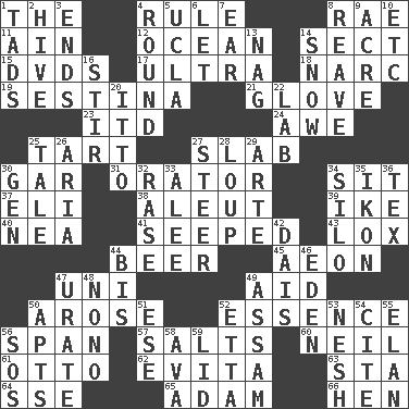 ACROSS 1. Definite Article 4. Governing power 8. Actress Charlotte 11. The 18th letter of the Arabic alphabet 12. Sea 14. Religious group 15. Movie discs 17. Extremist 18. Drug cop 19. French poetic form 21. Michael Jackson trademark 23. It would 24. Deep reverence 25. Small pie 27. Thick slice 30. Slender fish 31. Speaker 34. Be seated 37. Connecticut Ivy Leaguer 38. Eskimo relative 39. Mamie's mate 40. Teachers' org. 41. Oozed 43. Brine-cured salmon 44. Fermented drink made from hops 45. Age 47. Corn or form start 49. Help 50. Came up 52. Gist 56. Connect, as a bridge 57. Table seasonings 60. Famous astronaut Armstrong 61. "Beetle Bailey" pooch 62. Webber/Rice musical 63. R.R. building 64. Compass dir. 65. First man 66. Layer DOWN 1. Small boys 2. Hub of activity 3. Extremities 4. Having a circular shape 5. Southern CA. univ. 6. Allow 7. Ewer handle 8. Rob, plunder, or pillage 9. 43,560 square feet 10. And so on (abbr.) 13. Tired old horse 14. Frozen precipitation 16. Use a swizzle stick 20. "Tell ____ the Marines!" 22. Experiment locale 25. Story 26. Roberta Peters solo 27. Bull 28. Central Nebraska county 29. Johnson of "Laugh-In" 30. Commissioned military rank (abbr.) 32. Raze (variant) 33. Toward shelter 34. Grain storage tower 35. Picture 36. John Ritter's dad 42. Raised platform 44. Twice 46. Locale of original sin 47. A salt of uric acid 48. Words to Nanette 49. Indian state 50. Tenement units (abbr.) 51. Compass dir. 52. Singer James 53. Soft 54. Quote 55. Liveliness 56. Mayday 58. Actress Gardner 59. Hat (slang)